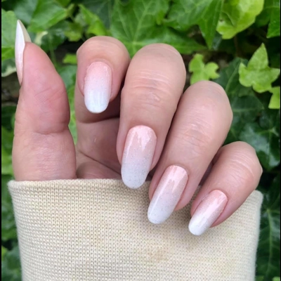 A peach baby boomer ombré sprinkled with holographic glitter.