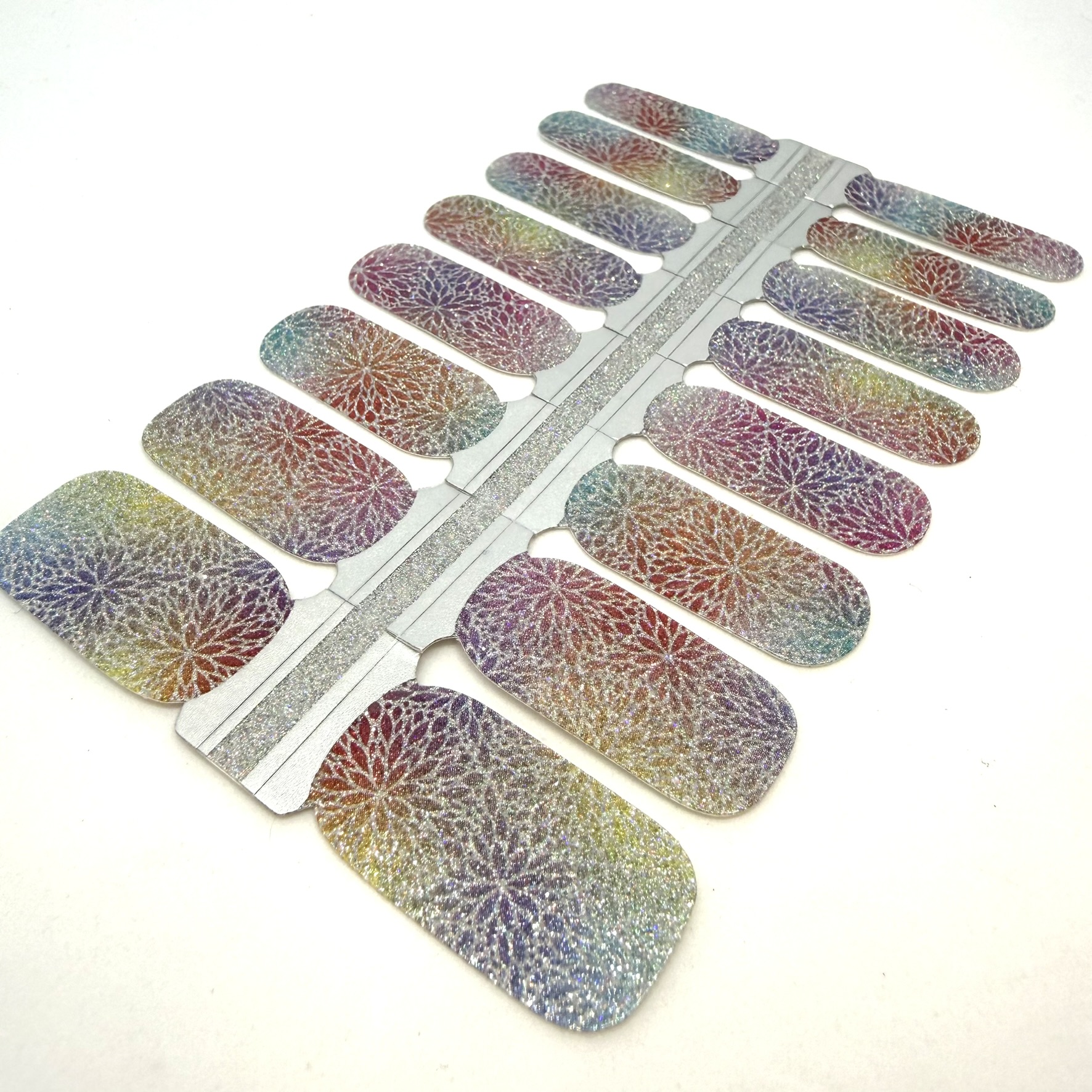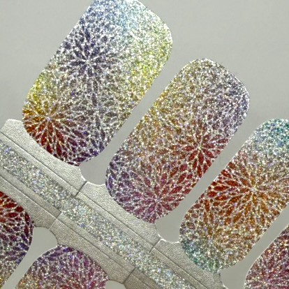 A rainbow shimmer base with oversized floral bursts that catch the light from every angle. This one is all about colour, shine, and having a bit of fun with your nails.