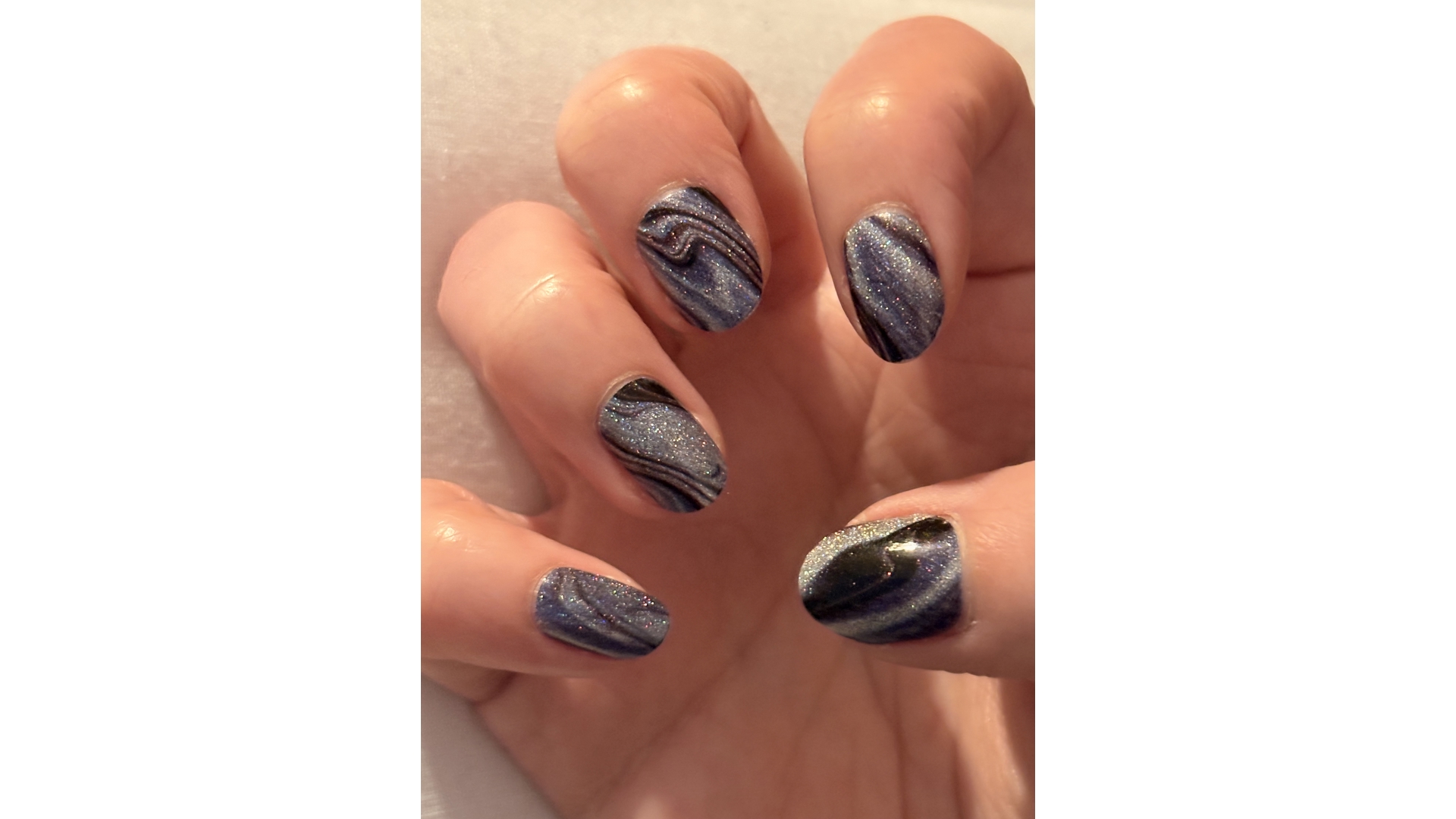 Wow! So much holographic! Black, silver and steel grey marble pattern set with holographic glitter.