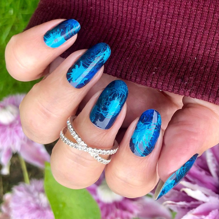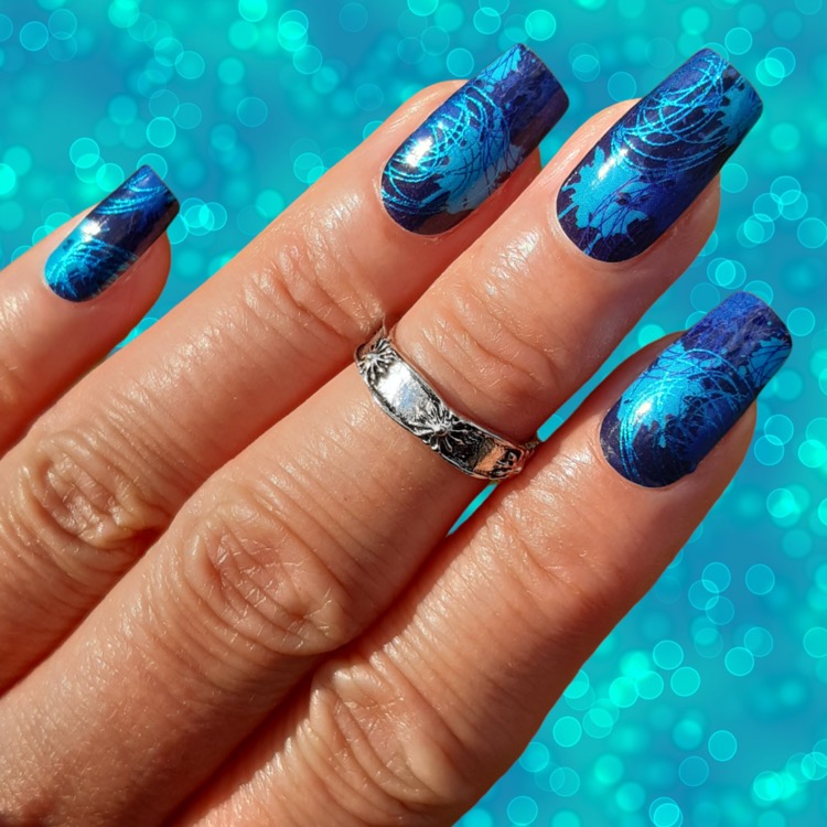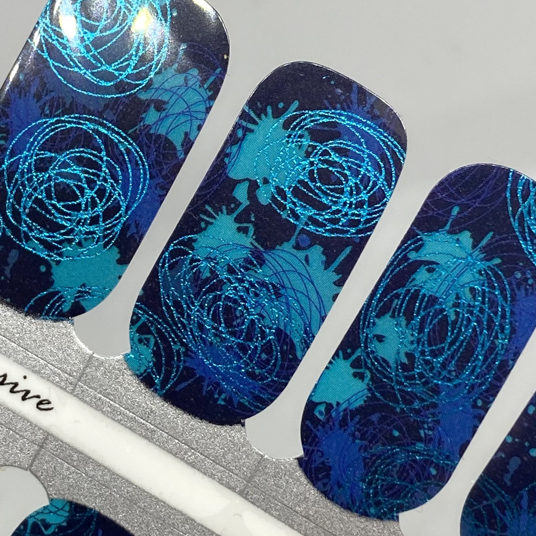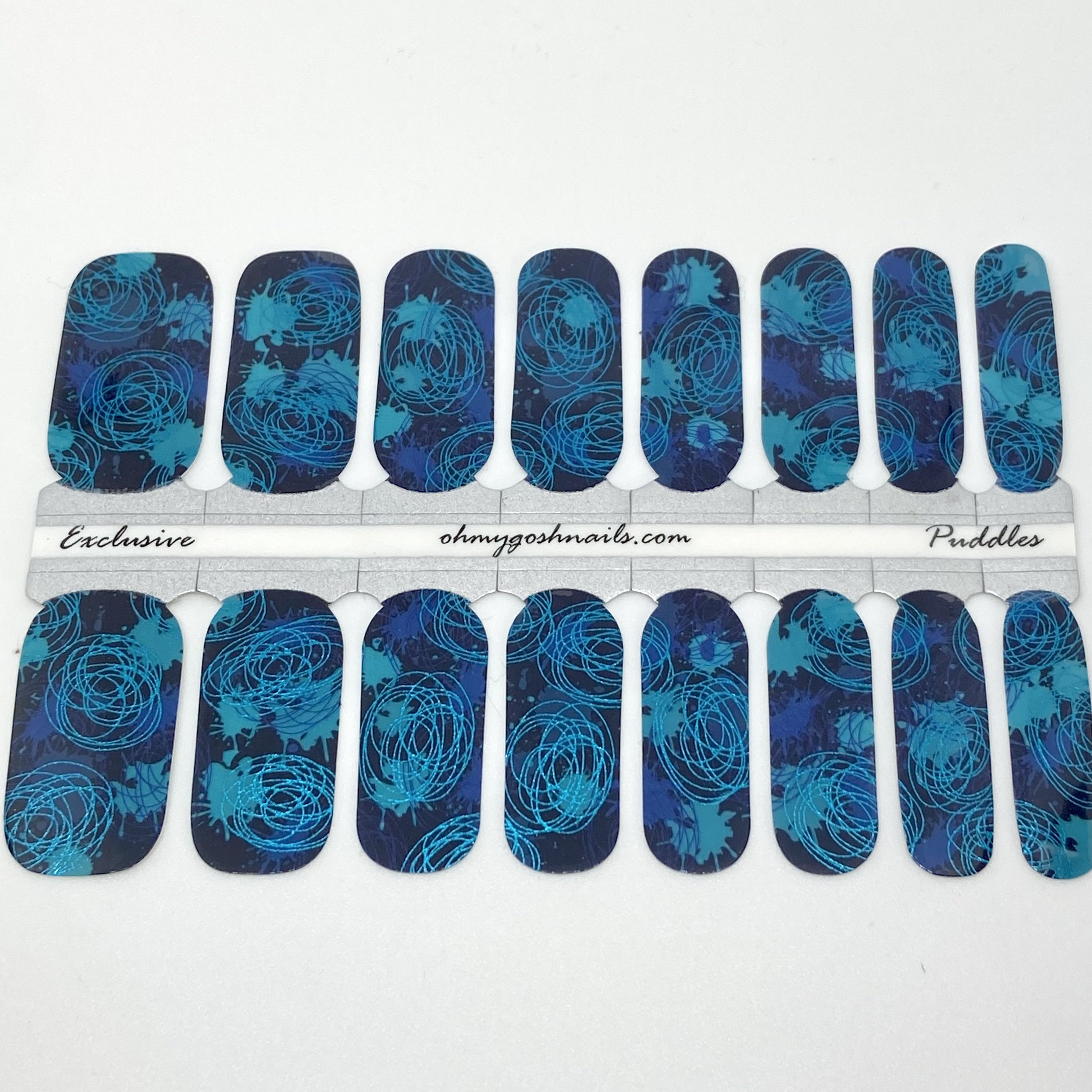 Puddles is an abstract splash pattern in tones of blue with metallic blue foil swirls