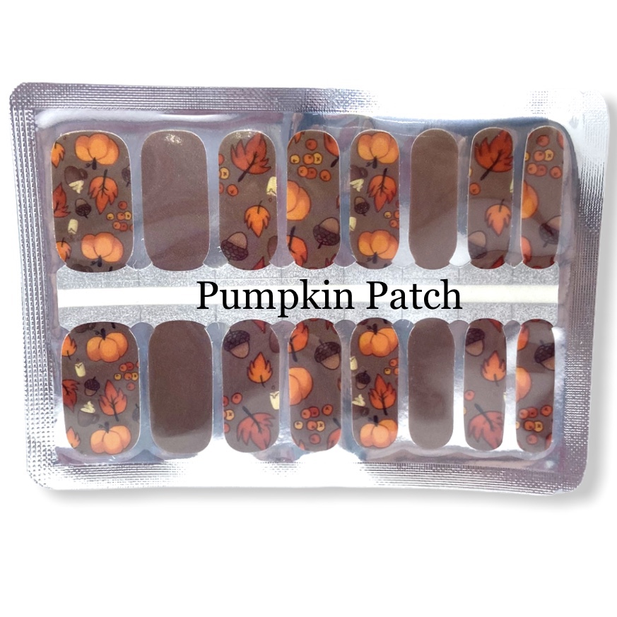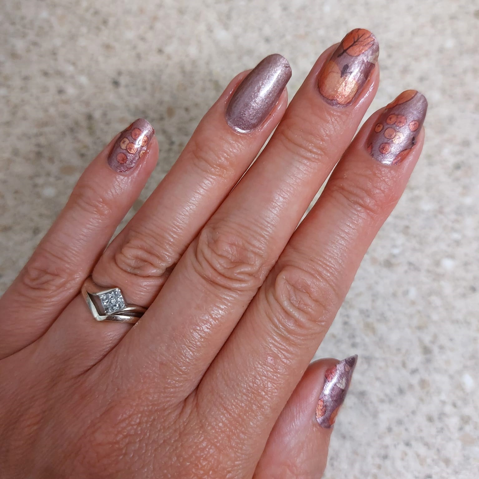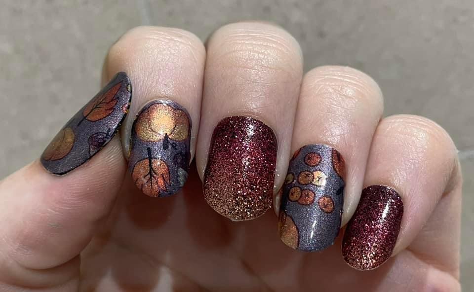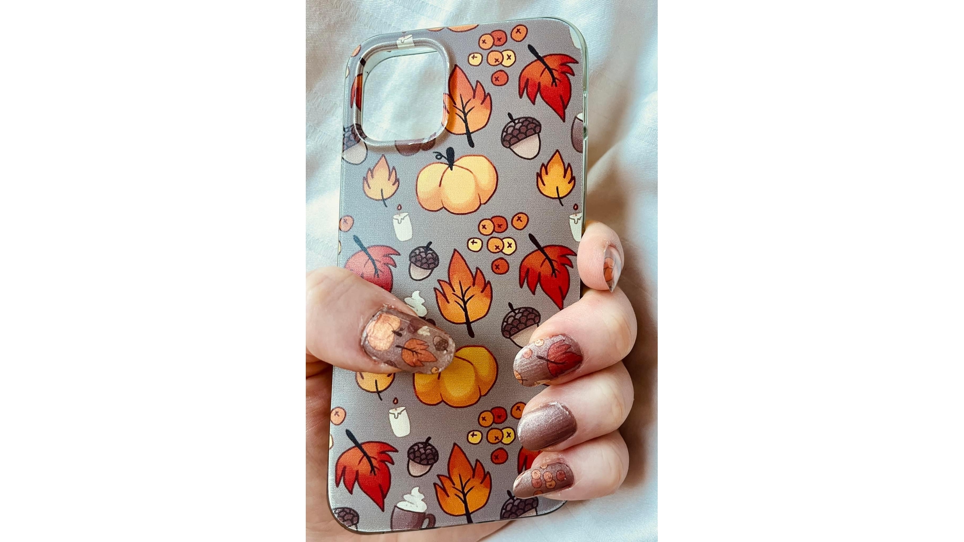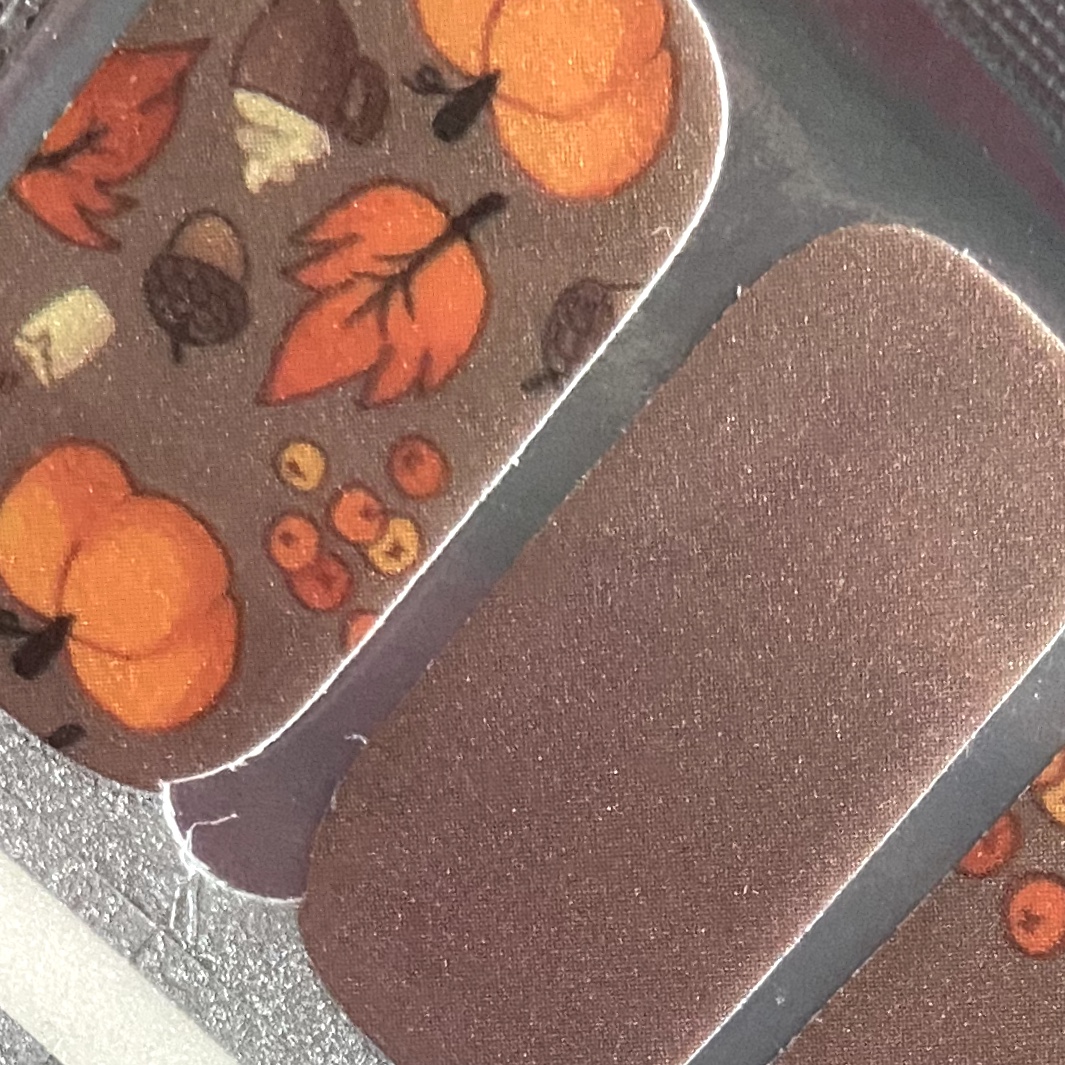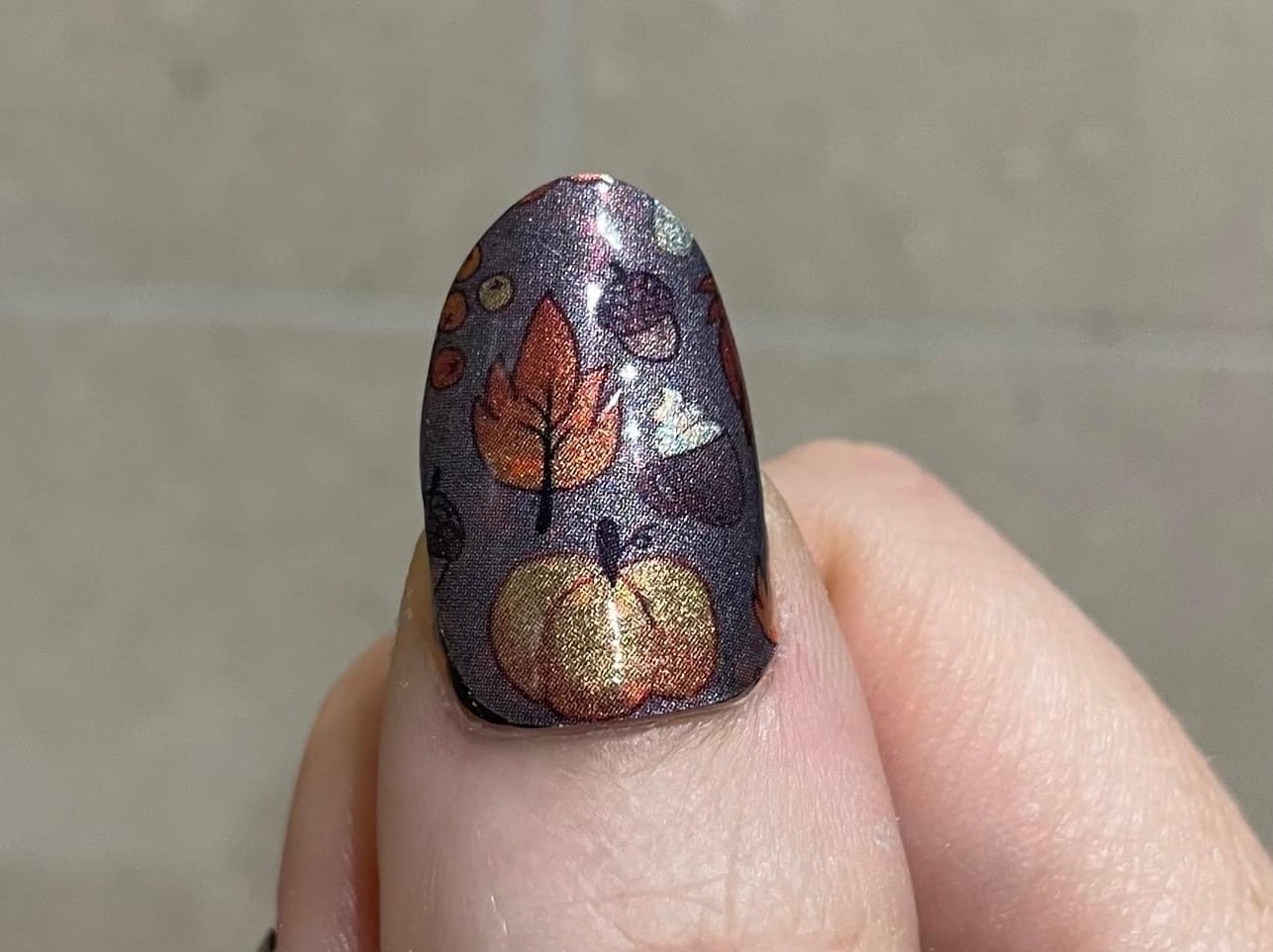 Shimmery design featuring autumn/fall leaves, acorns, pumpkins and is that hot chocolate or pumpkin spice latte?