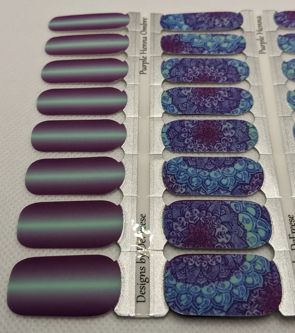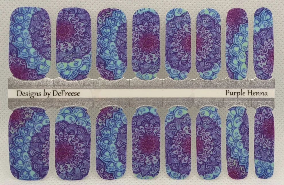 Purple Henna features big, bold mandala patterns with a purple and aqua base with a matte finish. You can turn it glossy with the addition of a gloss top coat. Co-ordinates with Purple Henna Ombre.