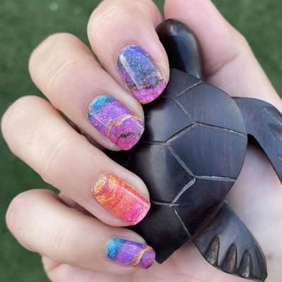 Bright red, oranges, purples and turquoise colours in a geode rock design topped with sprinkles of holographic glitter.