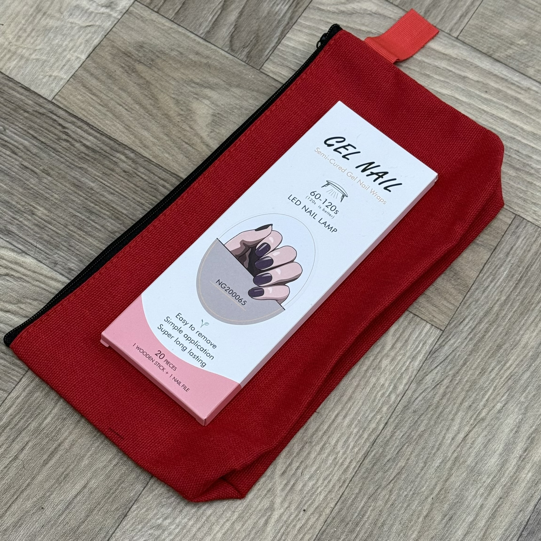 Red canvas zipped bag with hanging tag and gusset. Contents not included but available separately.