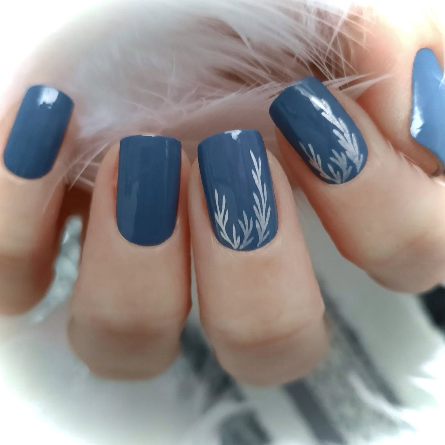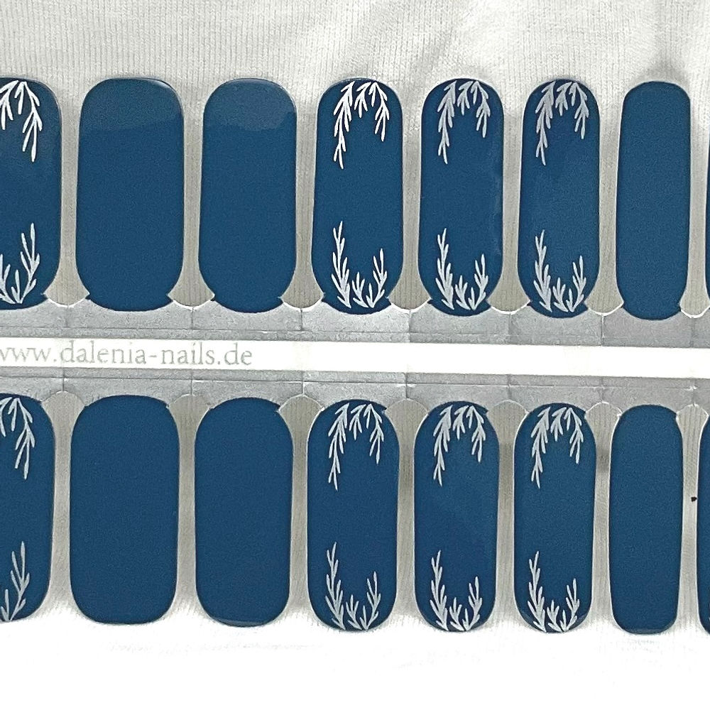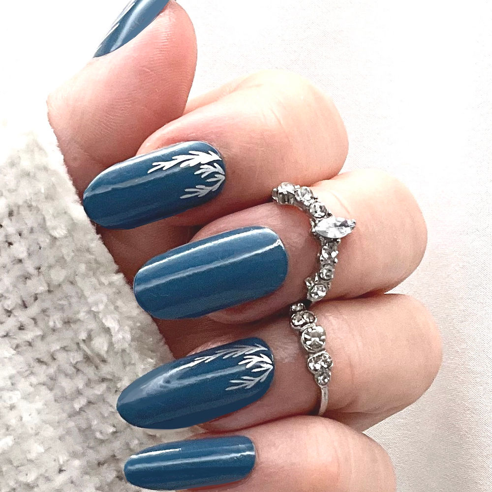 A deep petrol blue base creates a rich, soothing backdrop, finished with delicate silver metallic foil botanical detailing that softly frames the nails. The silver catches the light beautifully, adding a subtle shimmer that feels refined rather than flashy.