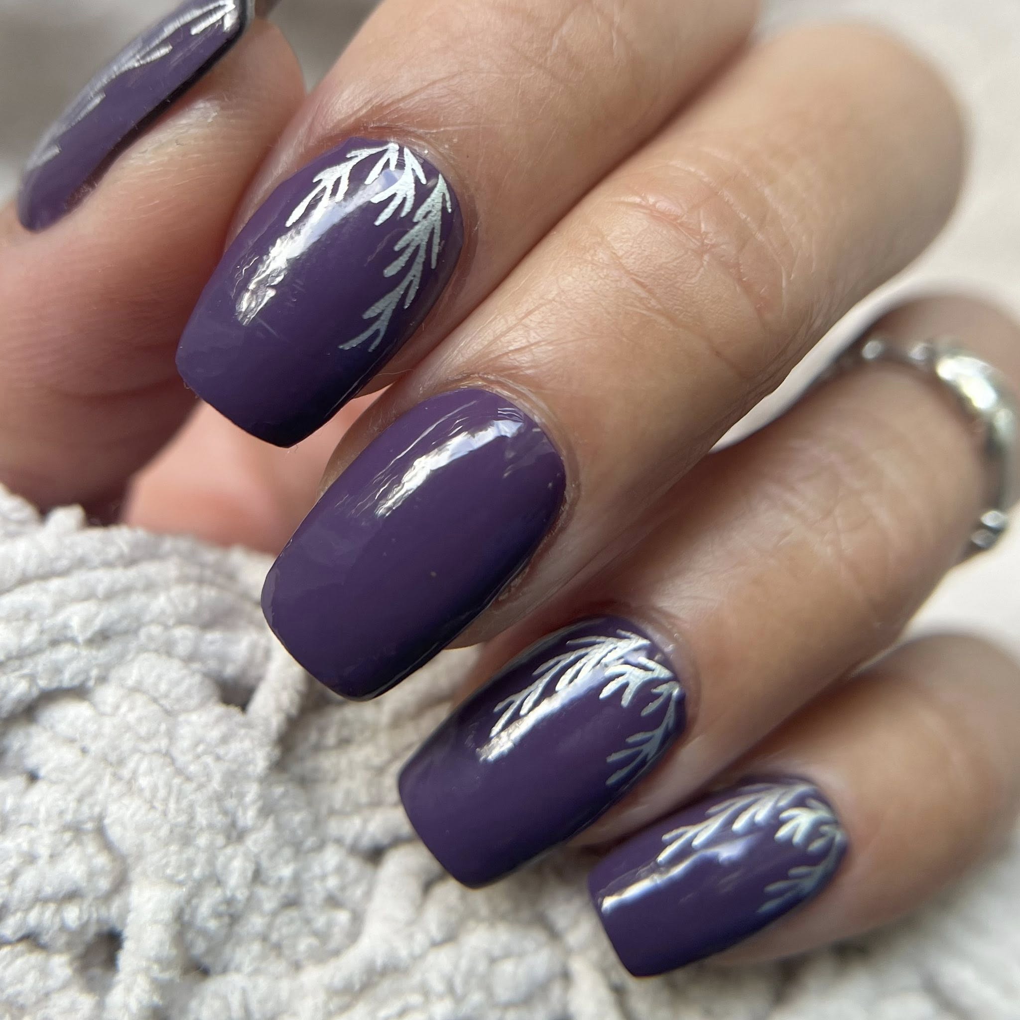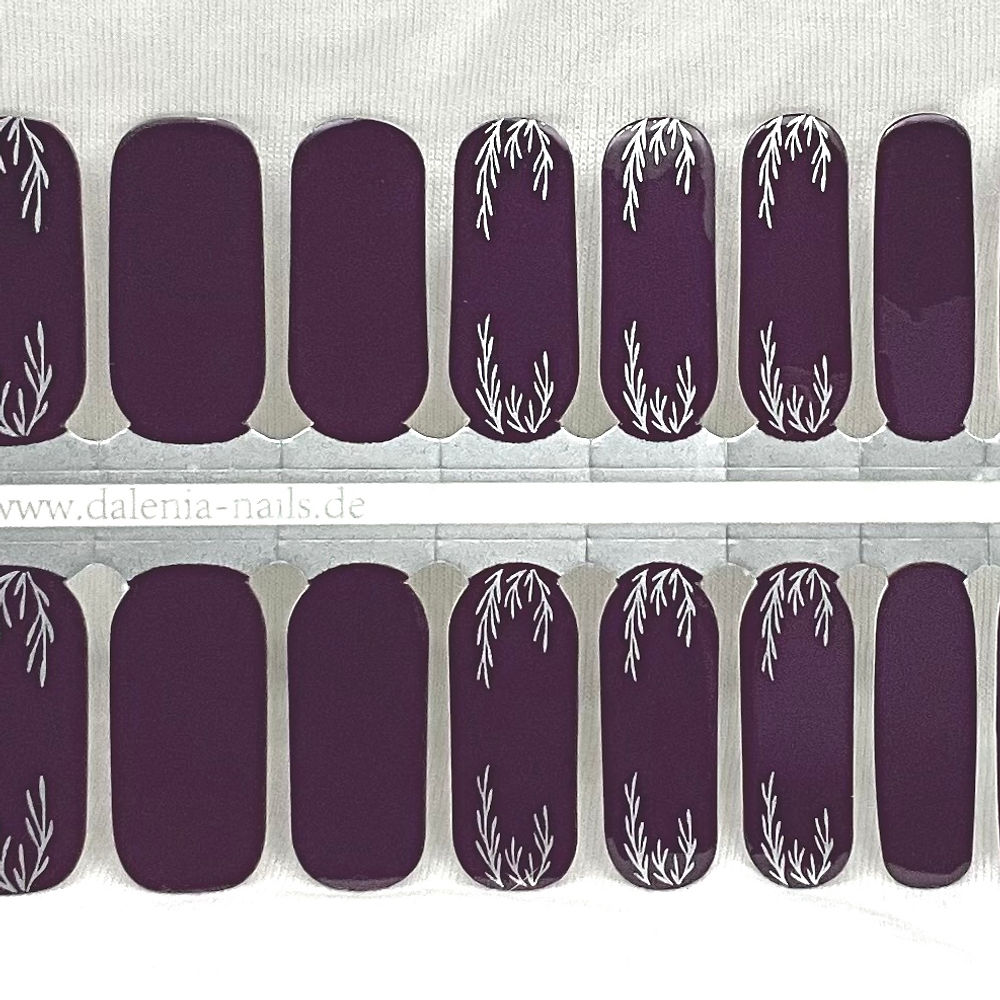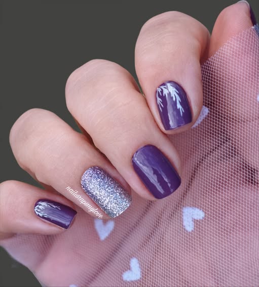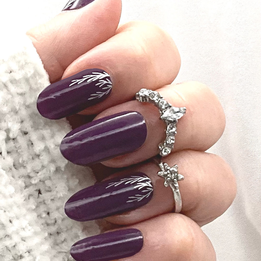 A rich, deep purple base sets the tone bold, elegant and quietly powerful. Delicate silver metallic foil botanicals trail across the nails, catching the light with a soft shimmer that feels luxurious rather than loud. The contrast between the inky purple and cool silver creates a look that is striking, refined and effortlessly grown up.