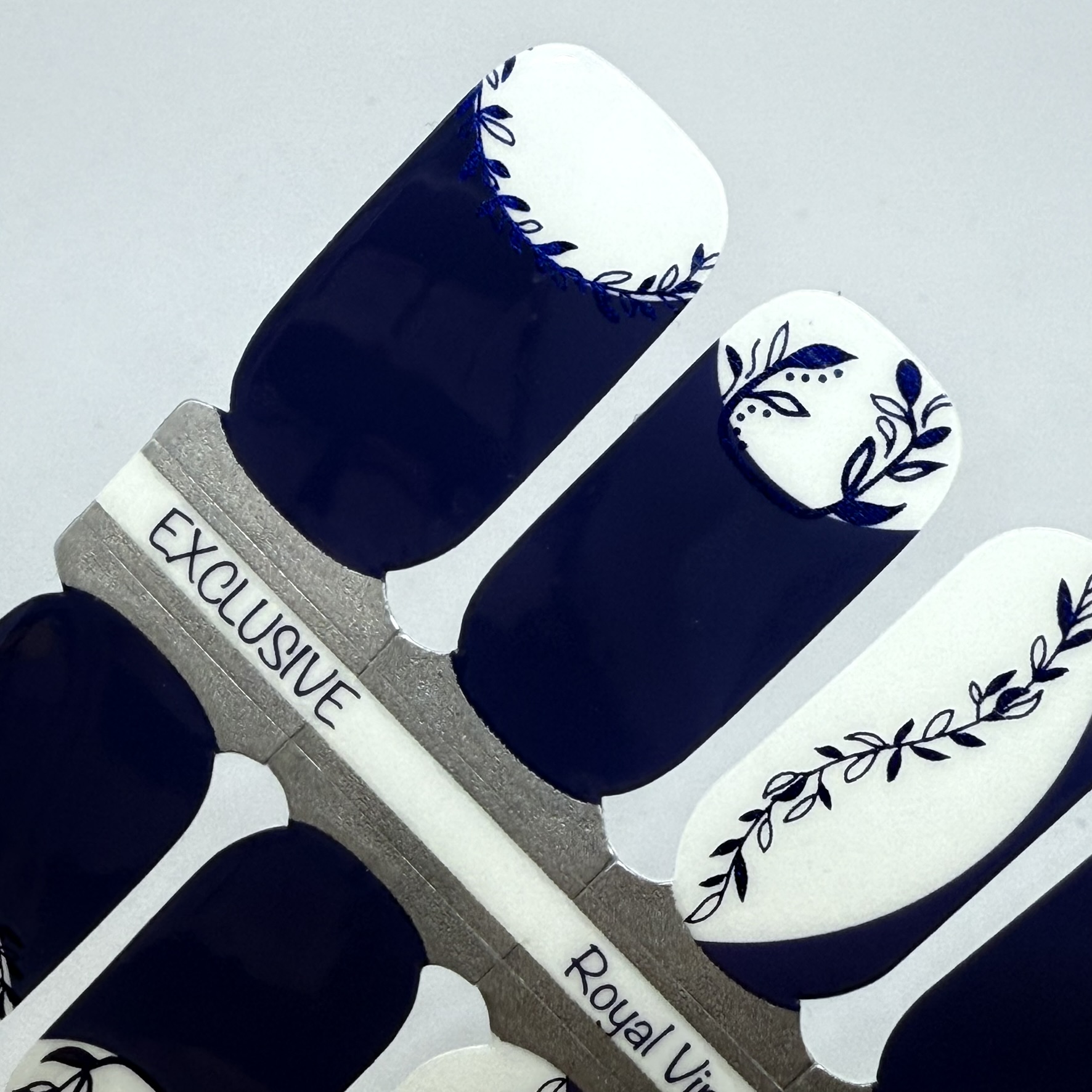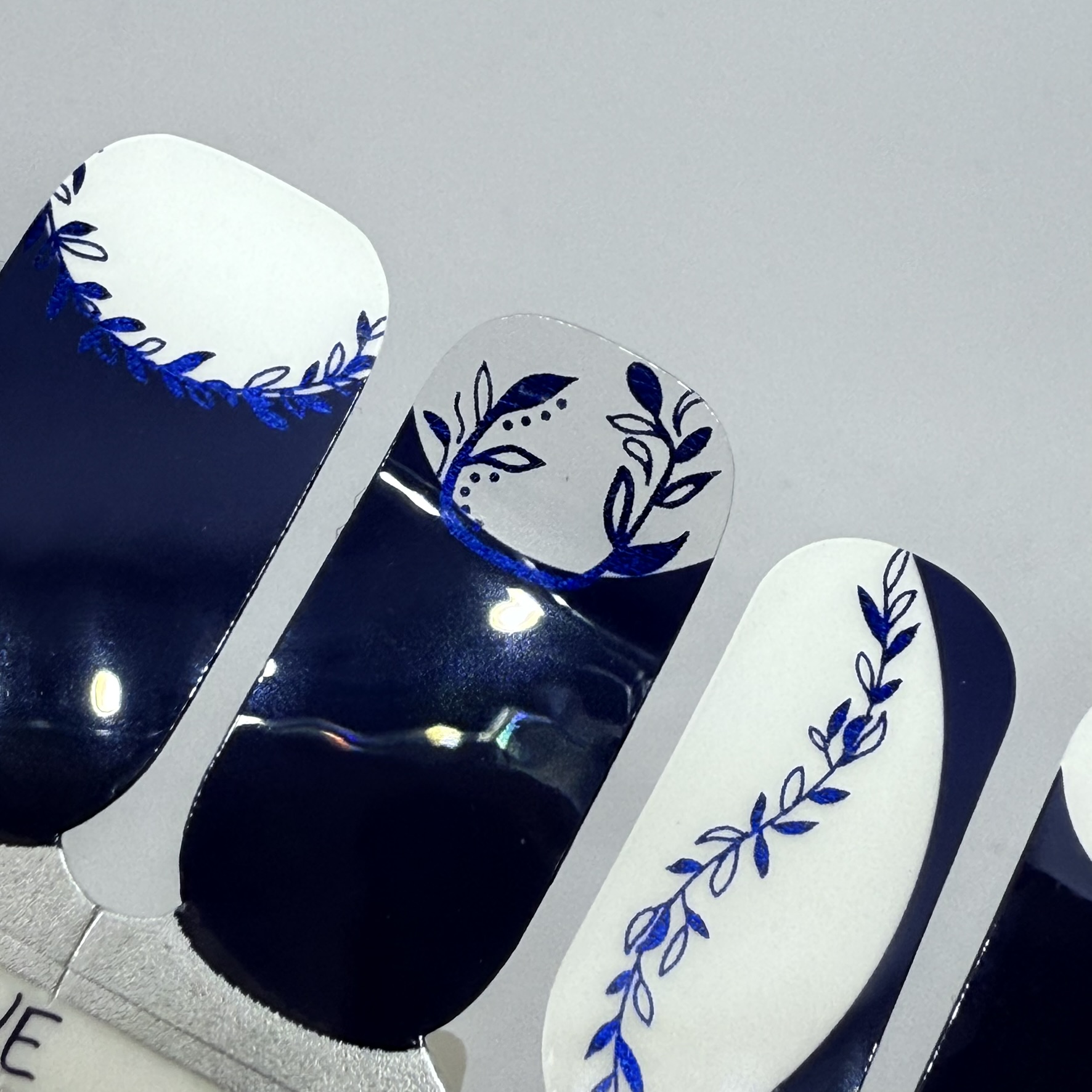 Royal blue with a hint of purple meets metallic blue foil leaves on transparent french tips. Clean classy and beautifully eye catching.