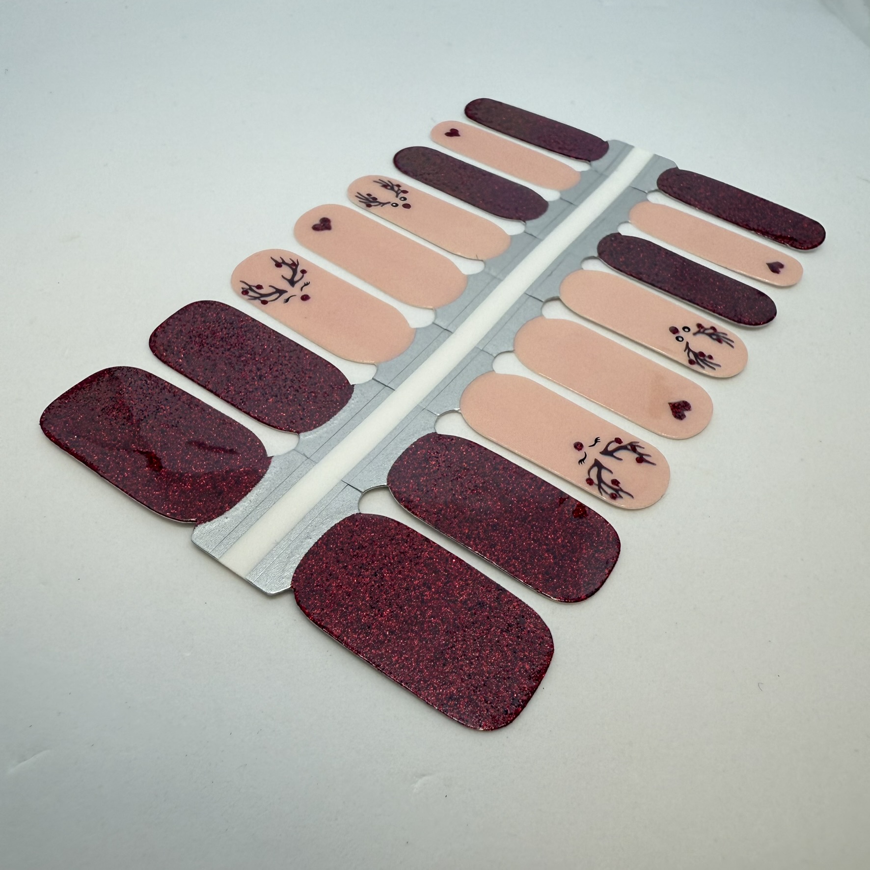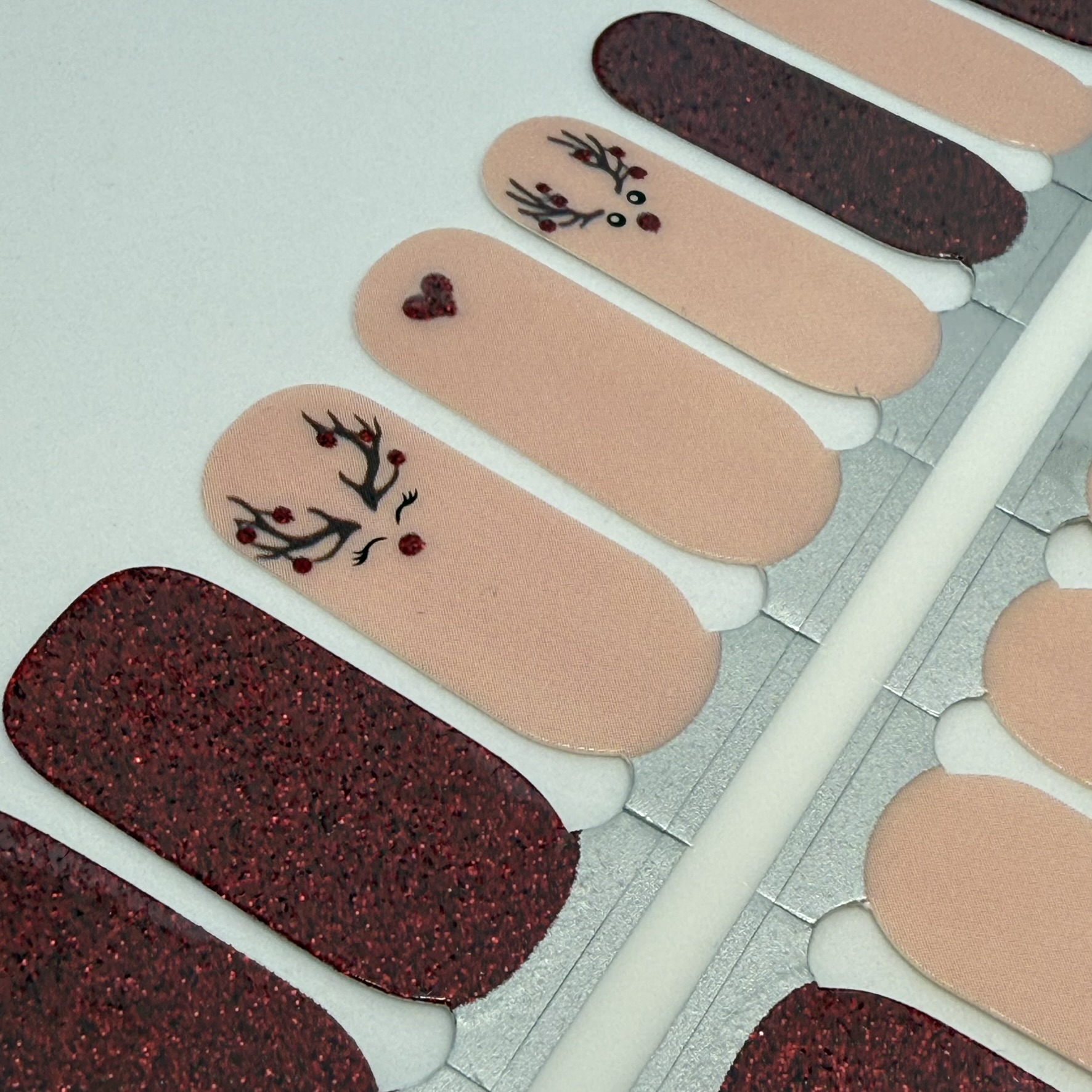 Soft blush nude nails paired with delicate berry branches and the sweetest tiny reindeer faces complete with sparkling red Rudolph noses. Finished with rich red glitter accents this set is cosy charming and full of festive romance.