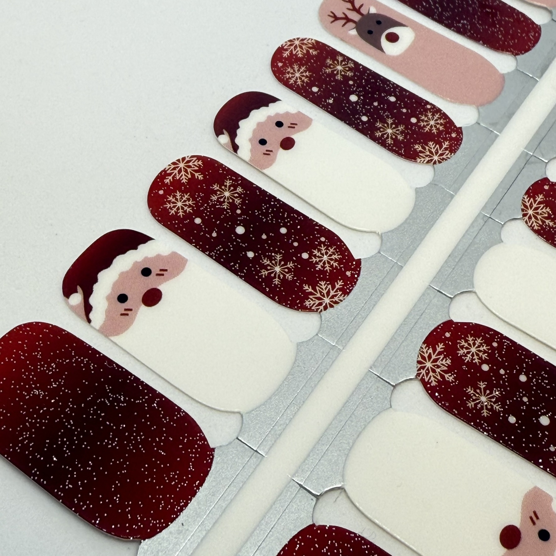 Berry red ombre topped with silver glitter and paired with the sweetest Santa and reindeer designs alongside delicate white snowflakes. A cheerful holiday set full of charm and Christmas magic.