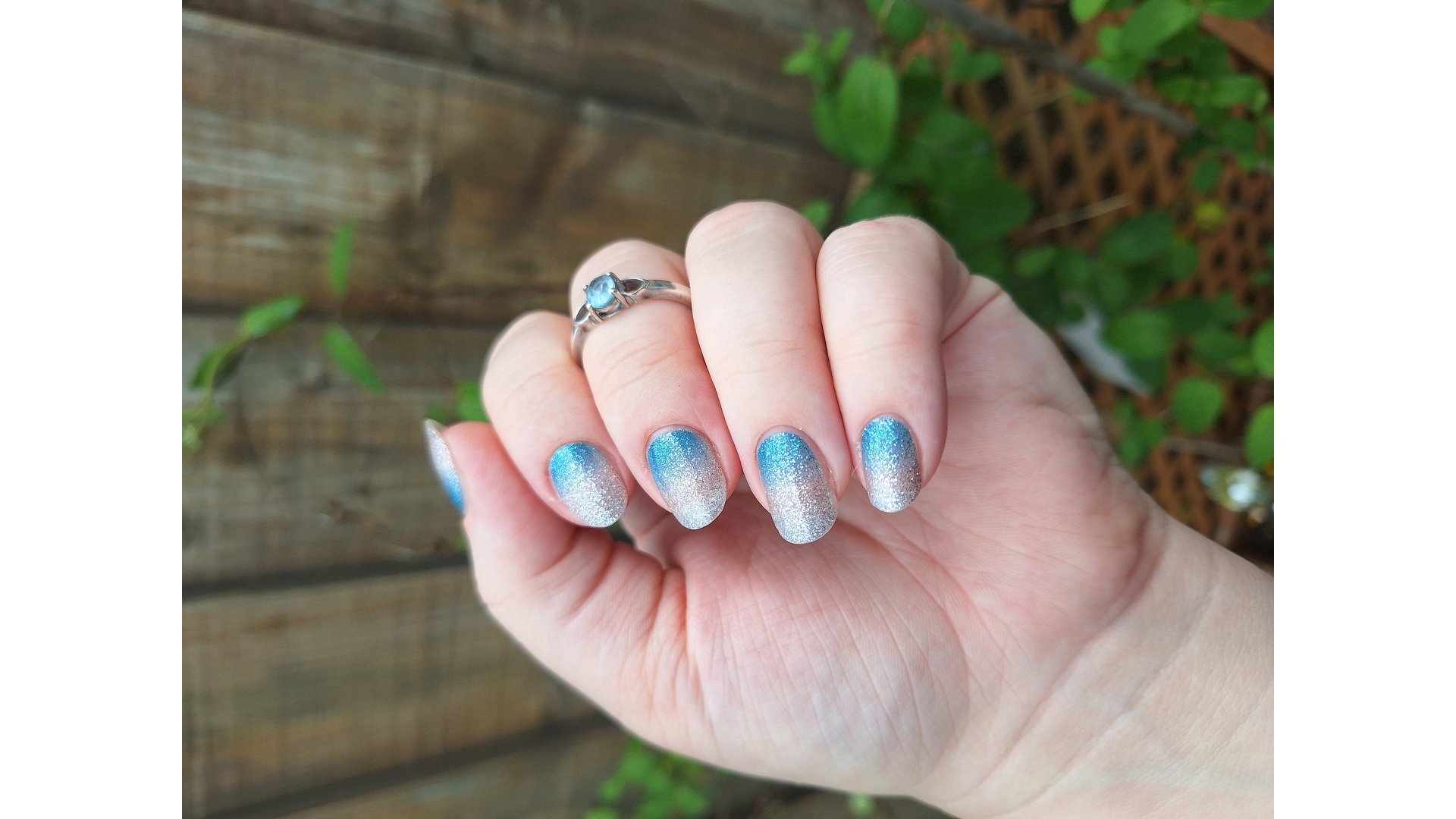 Beautiful semi sheer glitter ombré from aqua blue to silver. This set features sizes for wider nails and are easily trimmed to fit.