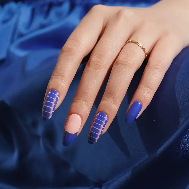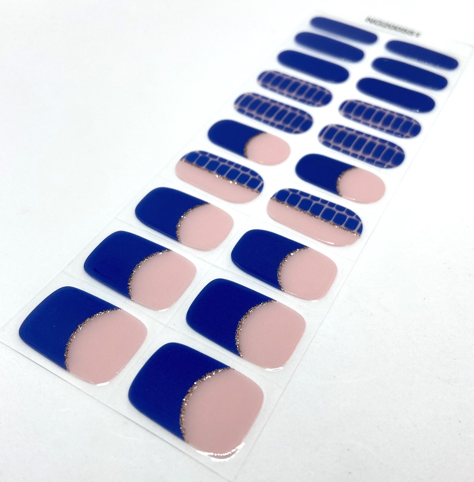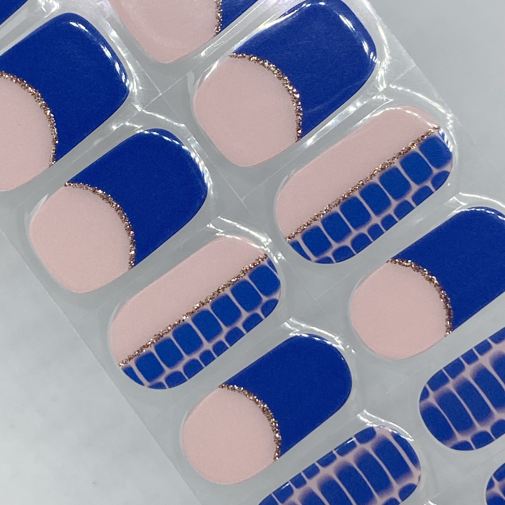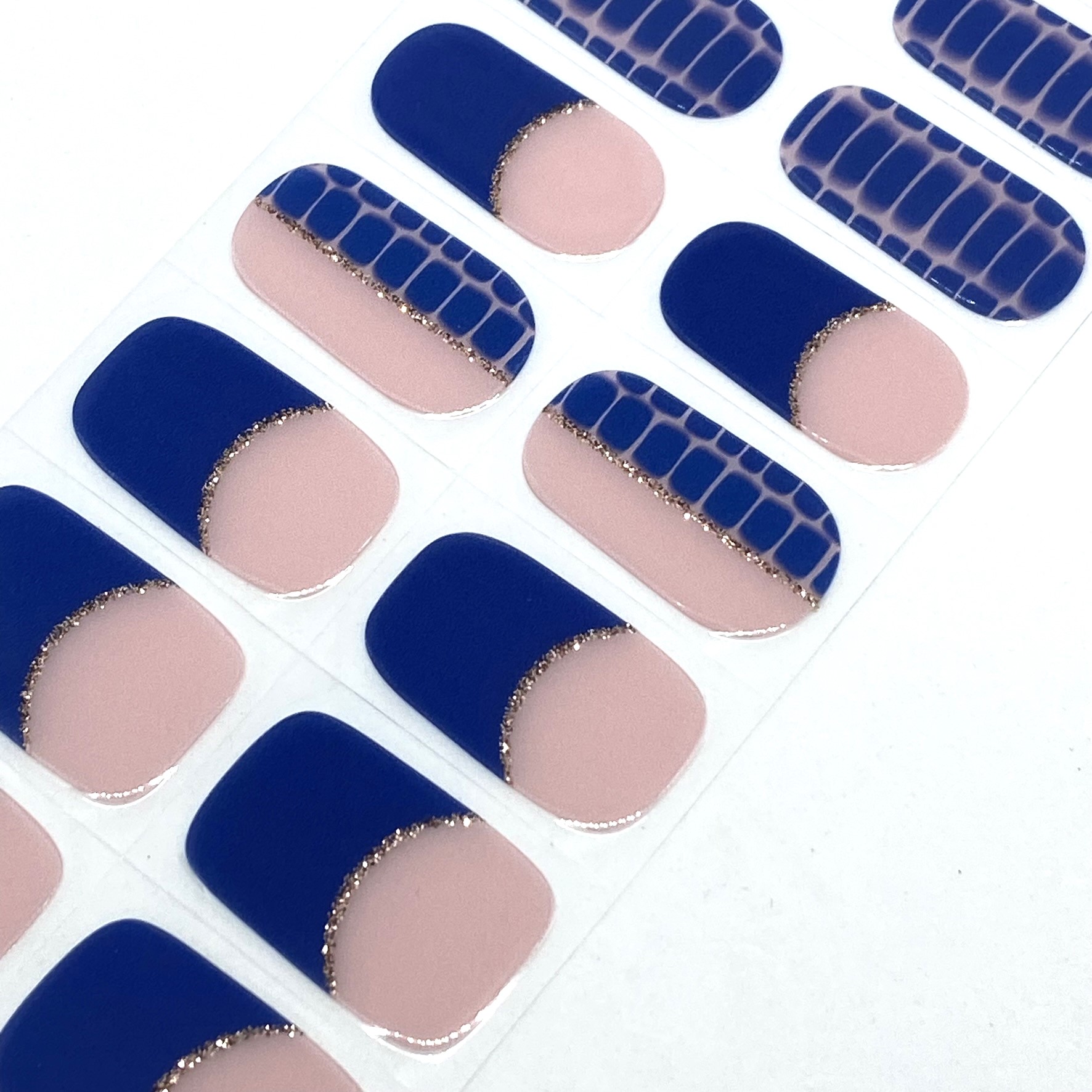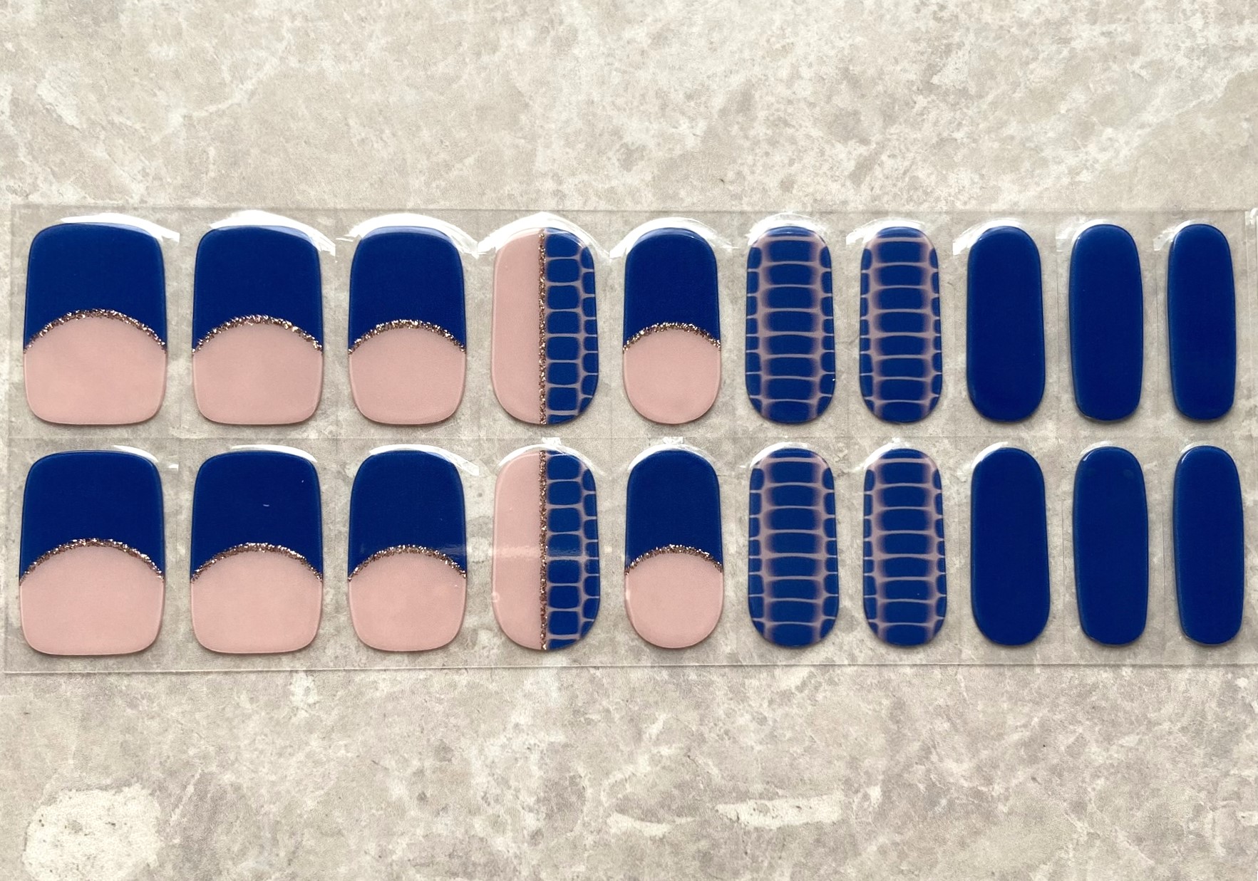 See You Later features blue French tips with a neutral pink base rose gold glitter lines and alligator print accents.