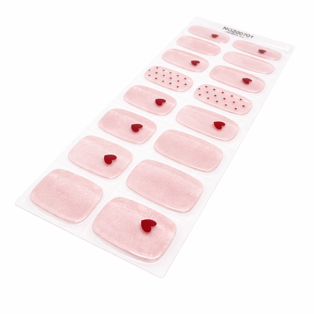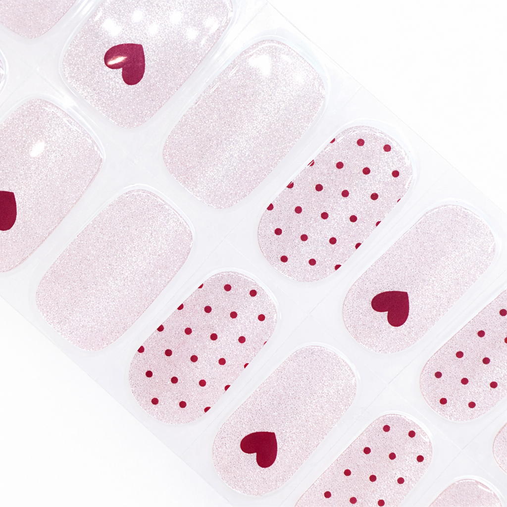 A sheer pale pink base is infused with a vertical magnetic cat’s eye shimmer, creating a soft velvet glow that catches the light beautifully. Finished with deep burgundy red hearts and delicate dotted details, this design feels elegant, intentional and effortlessly wearable.