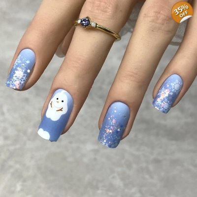 Snolaf features a cute marshmallowy snowman accents on a blue ombre base with white snowflakes and chunky iridescent confetti glitter.