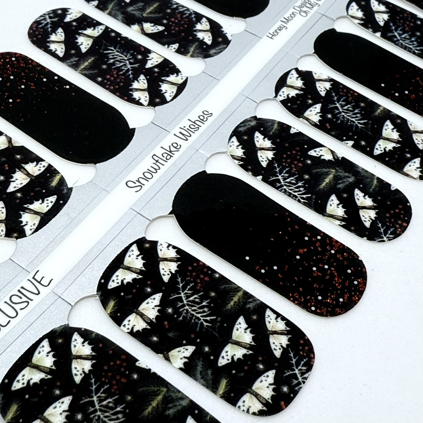 Dark elegant and full of detail. Snowy white moths dance through winter foliage while the red glitter nails add the perfect pop of festive sparkle.