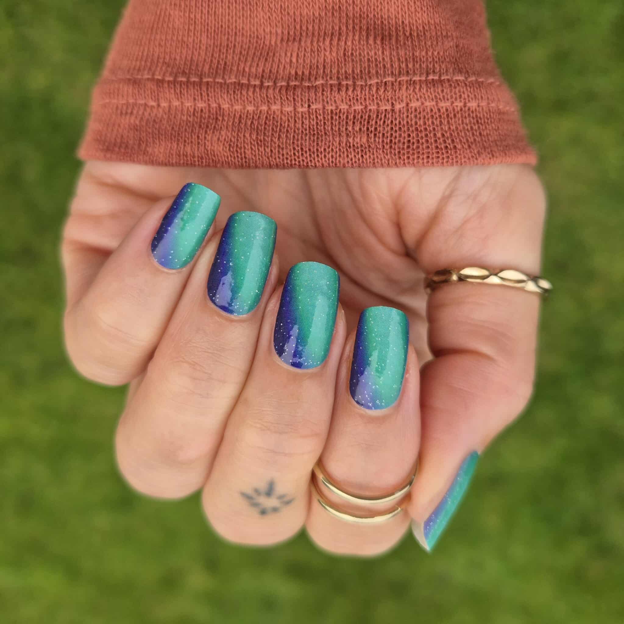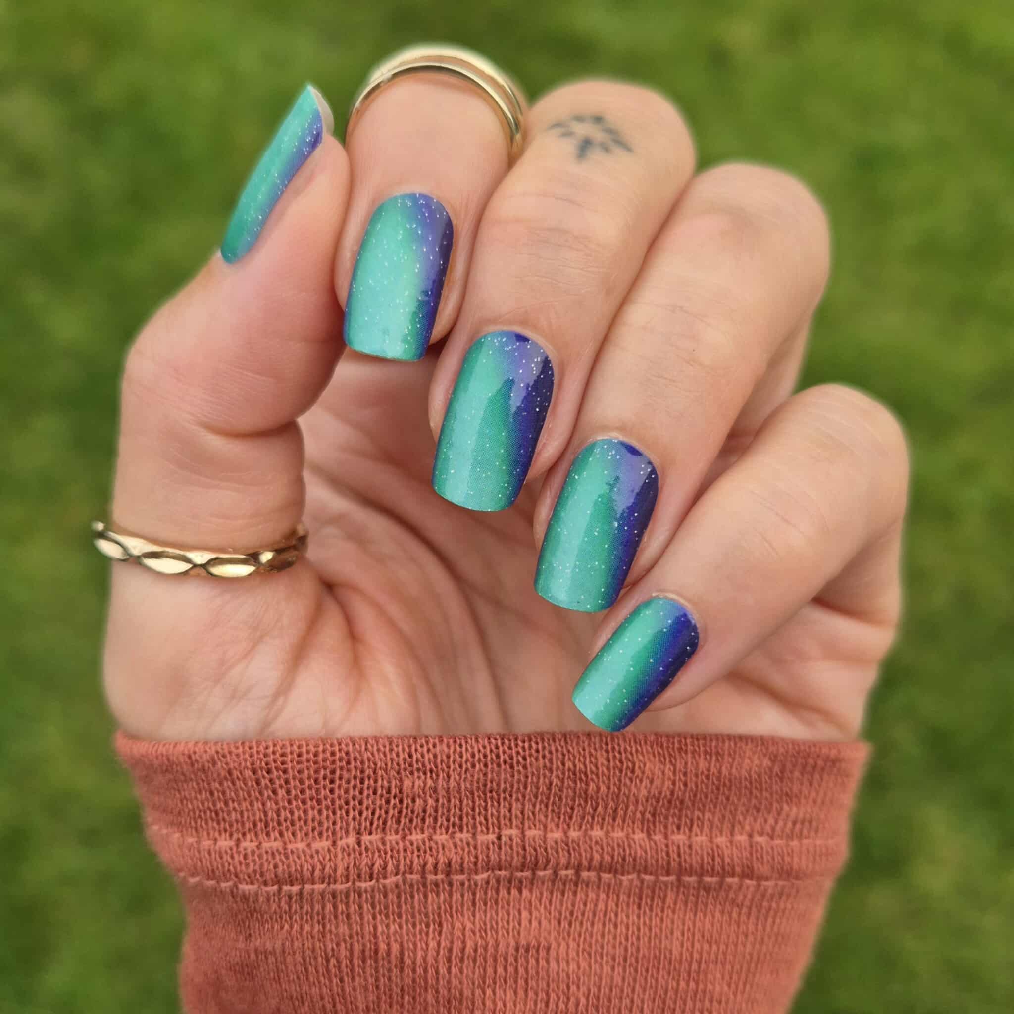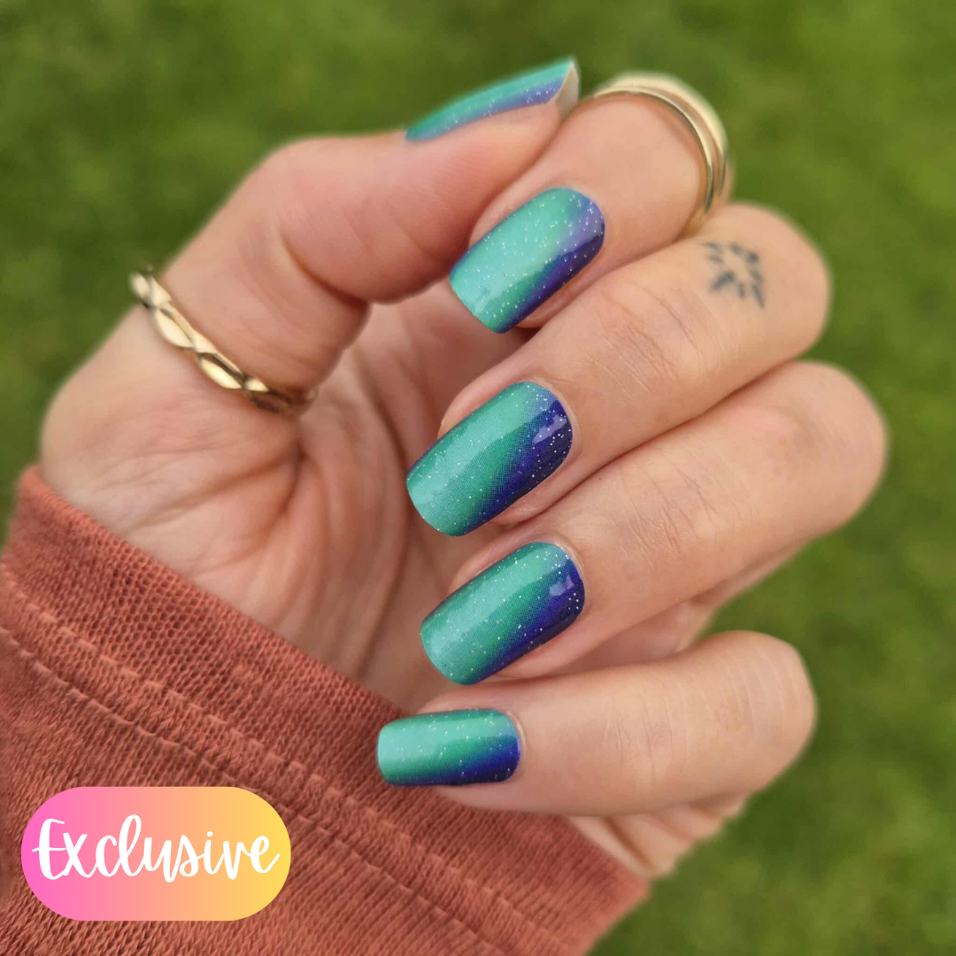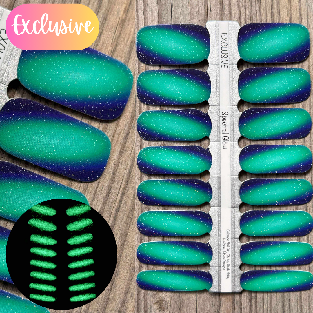 Light up the night with Spectral Glow! This mesmerizing design features a diagonal aura ombre in vivid teal and deep indigo, dusted with holographic glitter that twinkles like starlight. And when the lights go out? They glow an eerie, enchanting green for a look that’s out of this world.