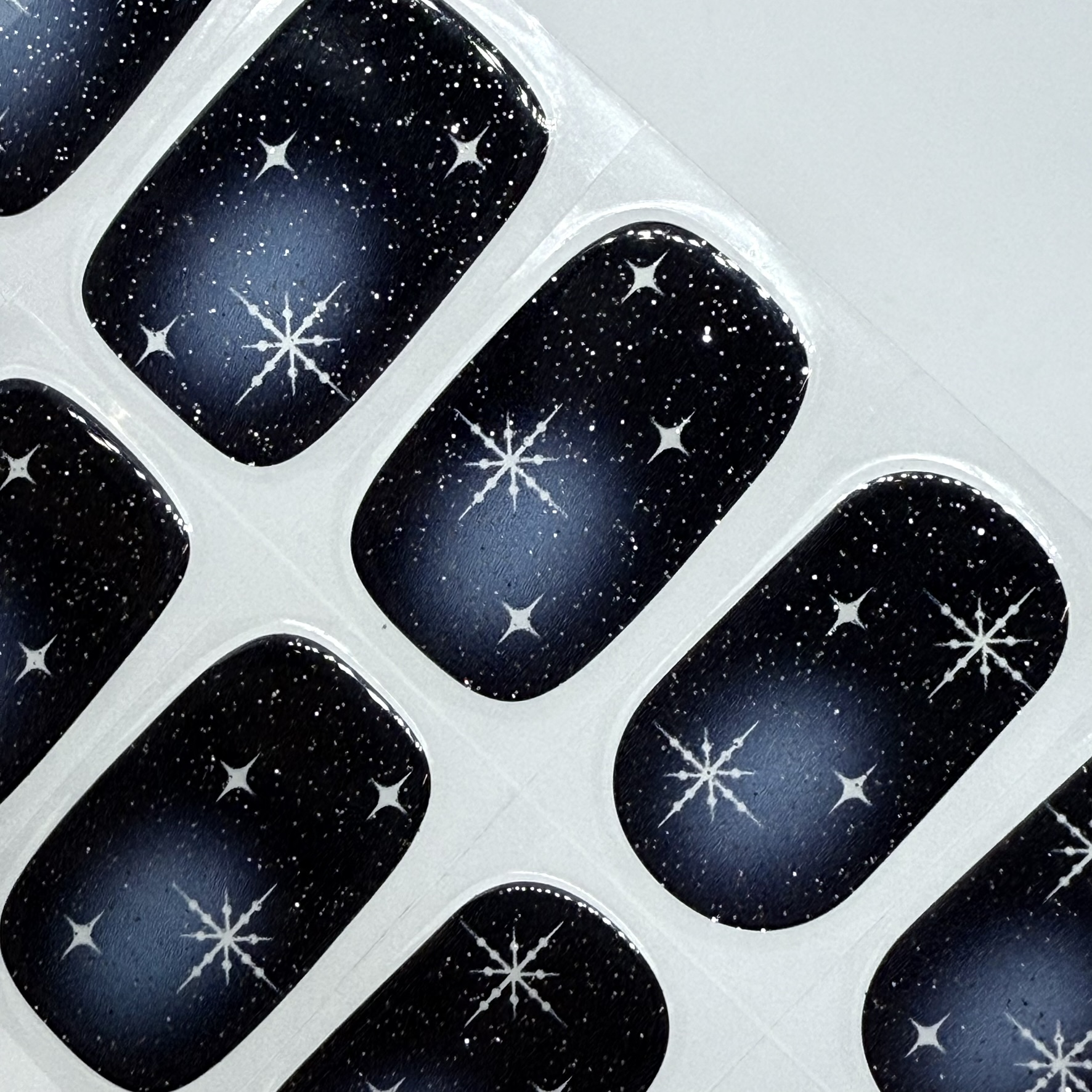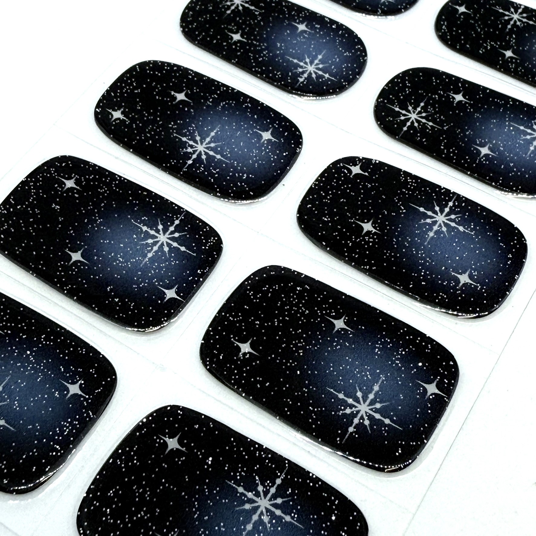 A deep navy and blue aura ombre sprinkled with tiny stardust speckles and bright shimmering starbursts. Elegant dreamy and full of celestial magic this set brings the quiet beauty of a winter night sky right to your fingertips.