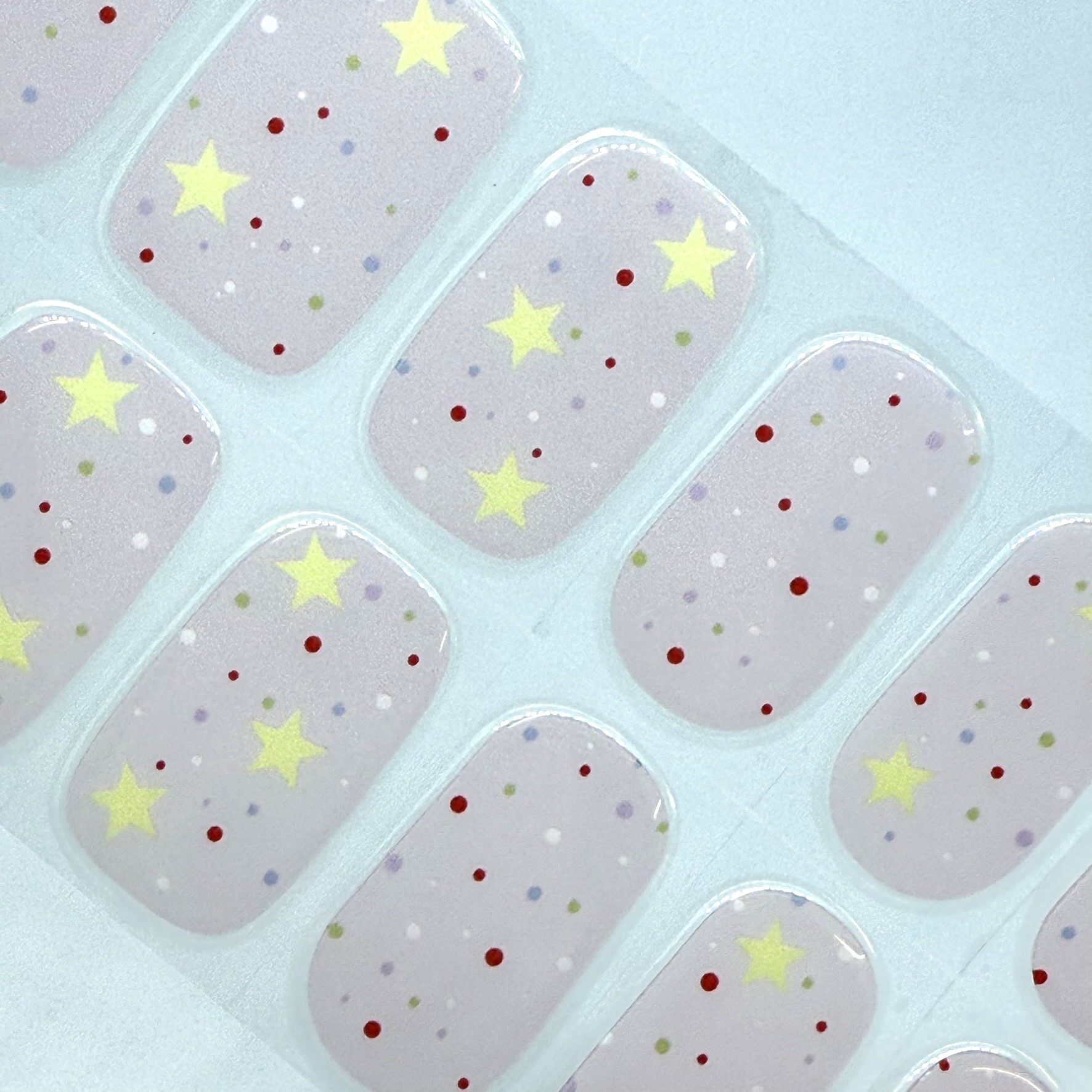 A sheer milky pink base sprinkled with colourful dots and soft yellow stars. Sweet playful and perfect for a touch of dreamy fun.