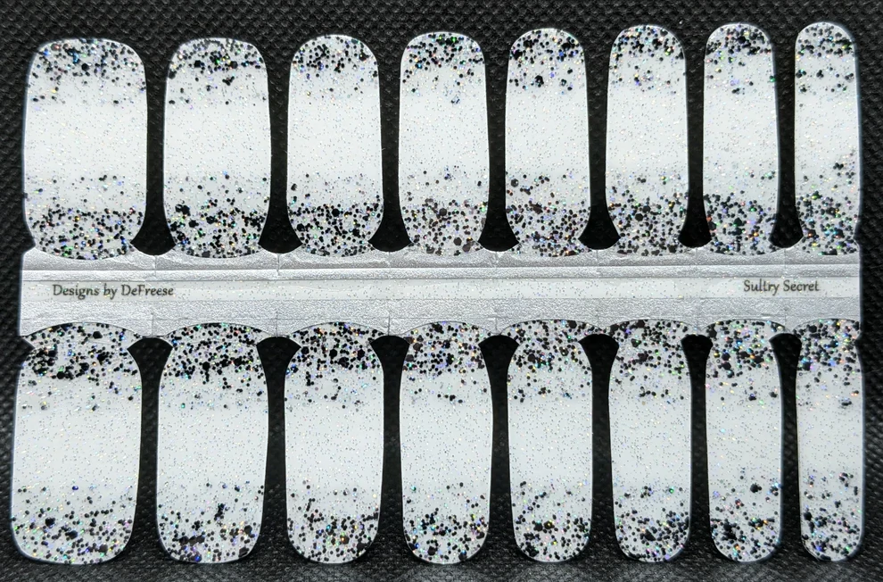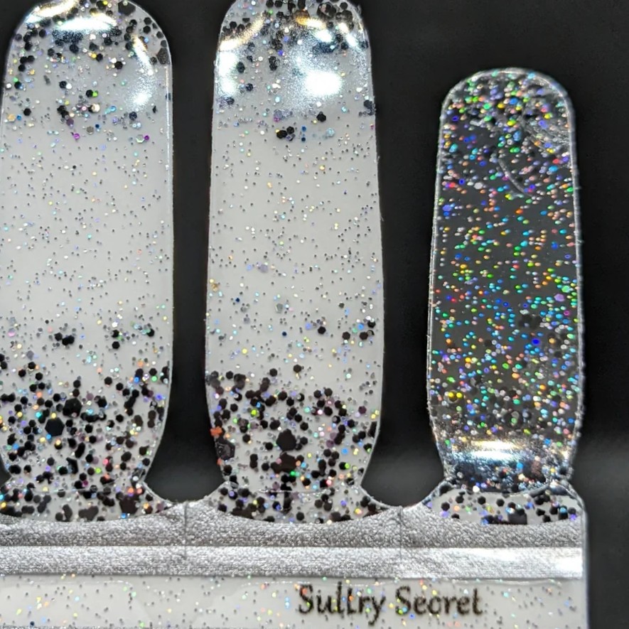 Sultry Secret is a holographic glitter with black flecks on a transparent base to wear alone or over another colour.