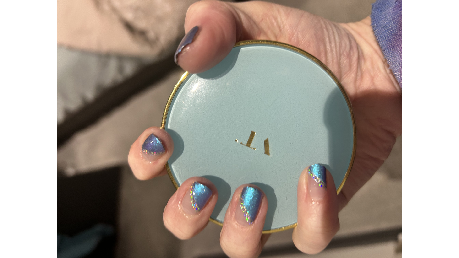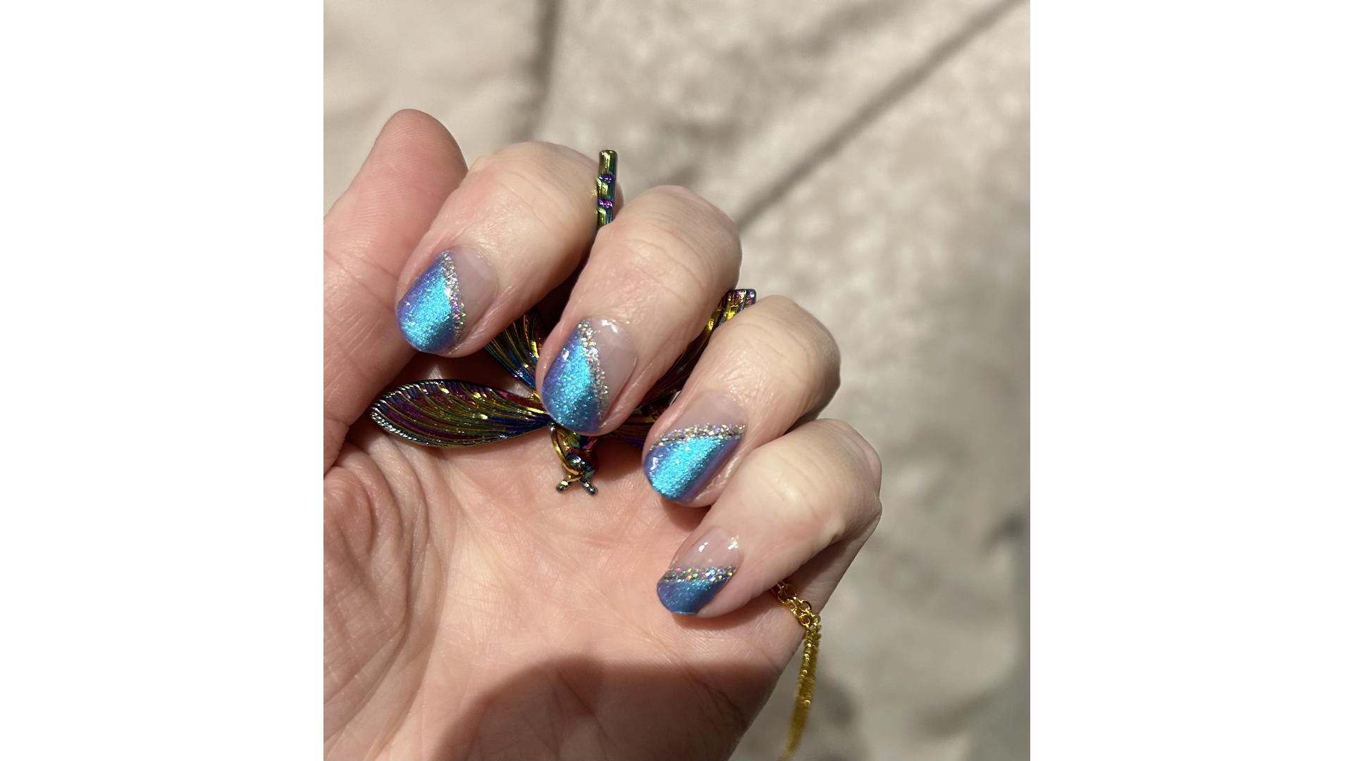 Beautiful colour shift wraps with negative space and a holo glitter line, I love these designs! Hard to take a photo that does them any justice.