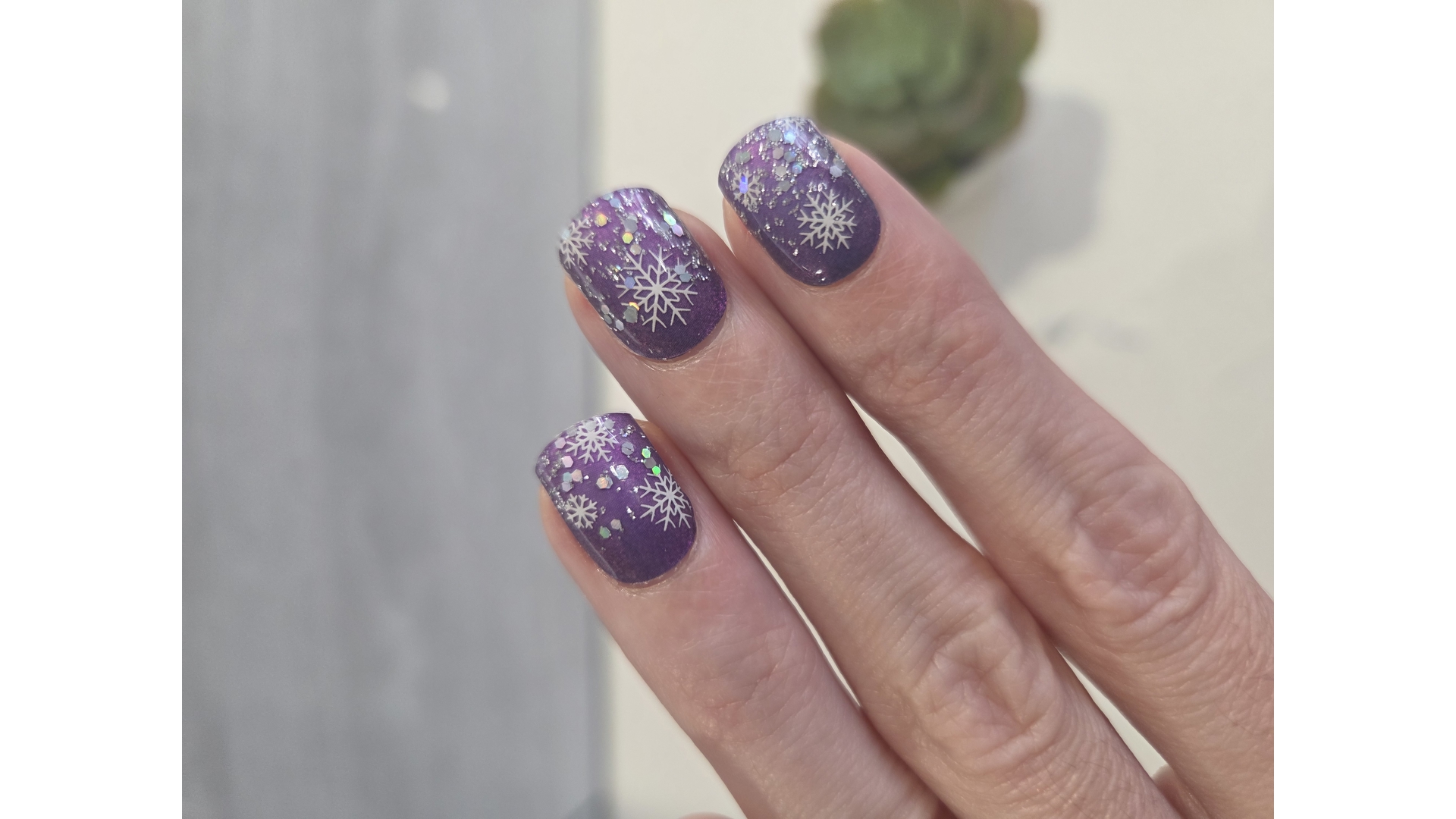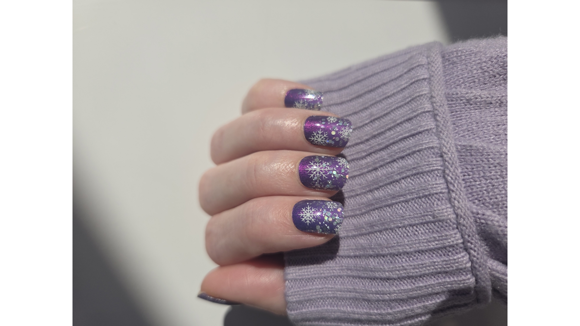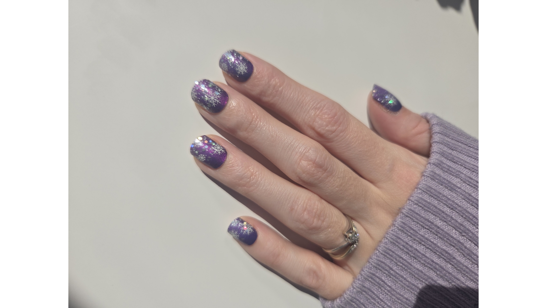 This purple is sooo pretty, gets lighter in the middle but very subtle. Has a little shimmer to it. I topped with Snowflake Sparkle GelLite.