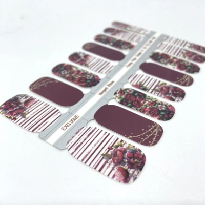 Pretty wine coloured blooms on a striped background with matching wine coloured accents and gold glitter curves.