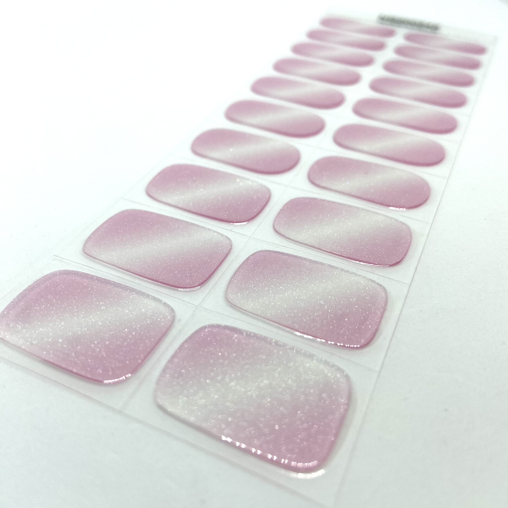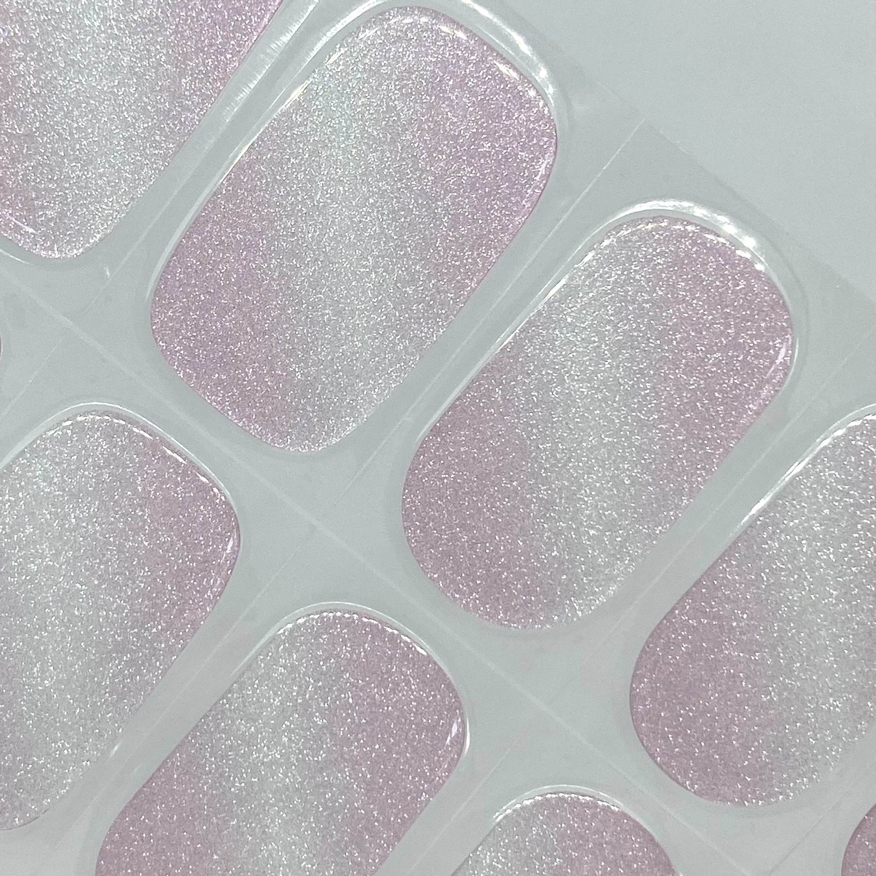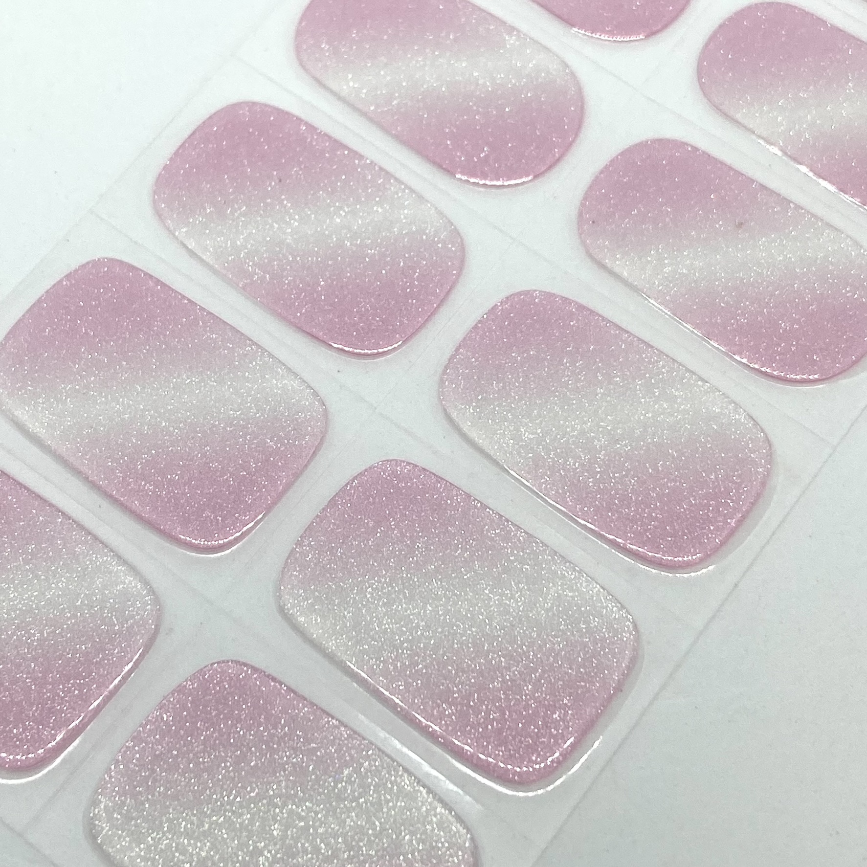 Wavering Light is a gentle, understated diagonal ombre, pink to white, on a semi sheer background with holographic glitter throughout.