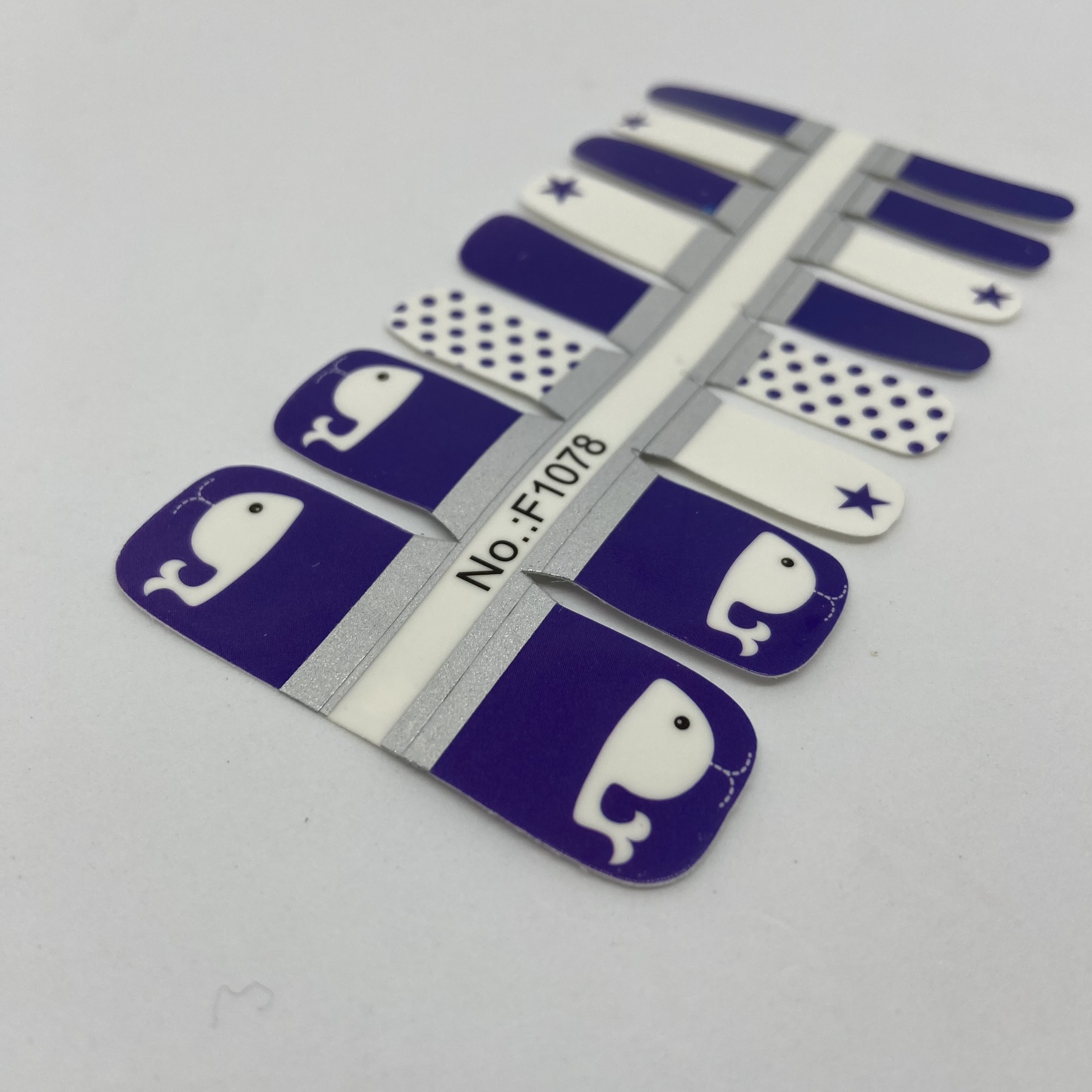 Our Whale of a Time Pedi Pack features cute white whales on a blue base alongside dots and stars on a white base. Pedi packs contain sizes specifically designed for toes.