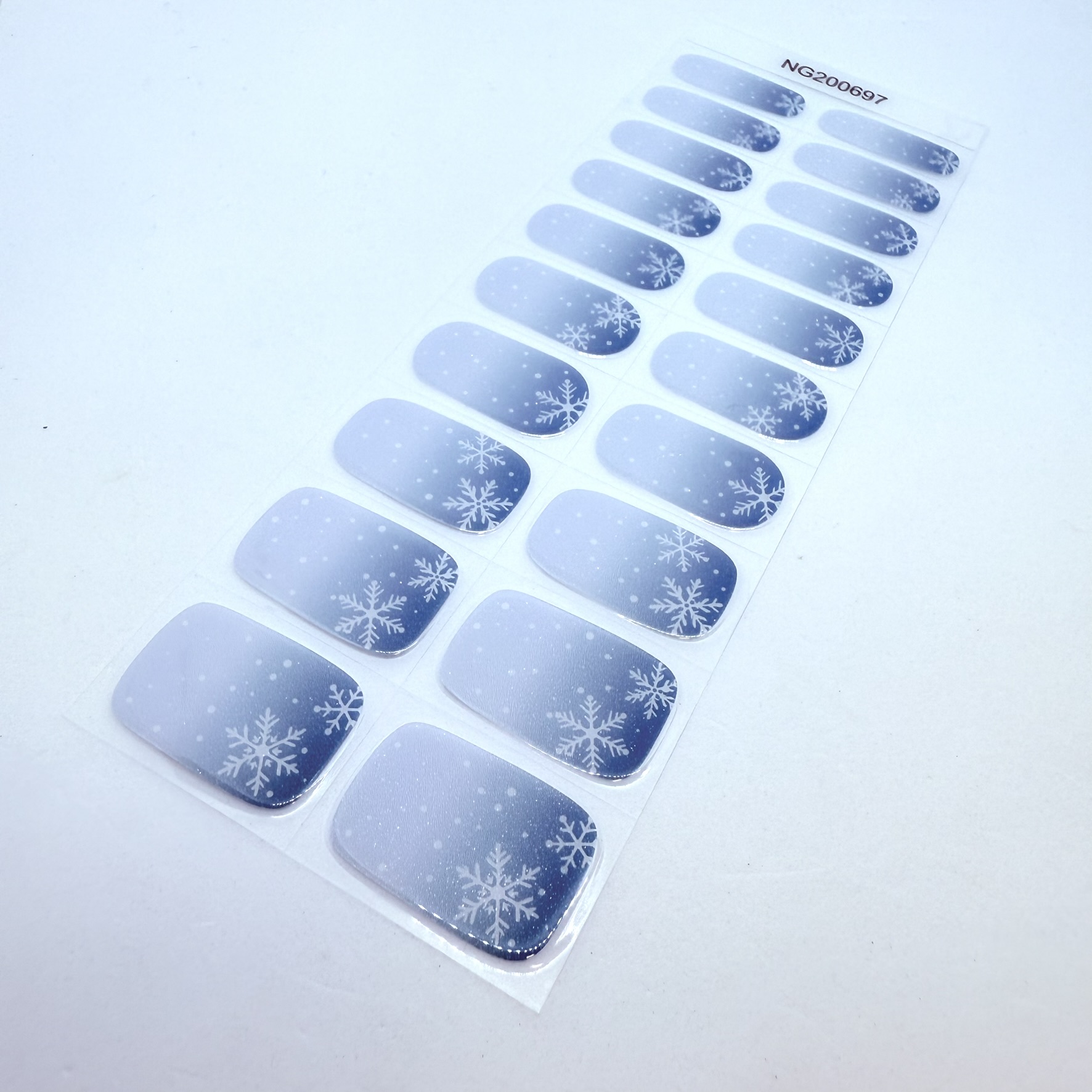 Cool, calming and beautifully understated. Winter Whisper blends soft icy blues into a gentle frosted fade, finished with delicate snowflake details that feel elegant rather than overdone.