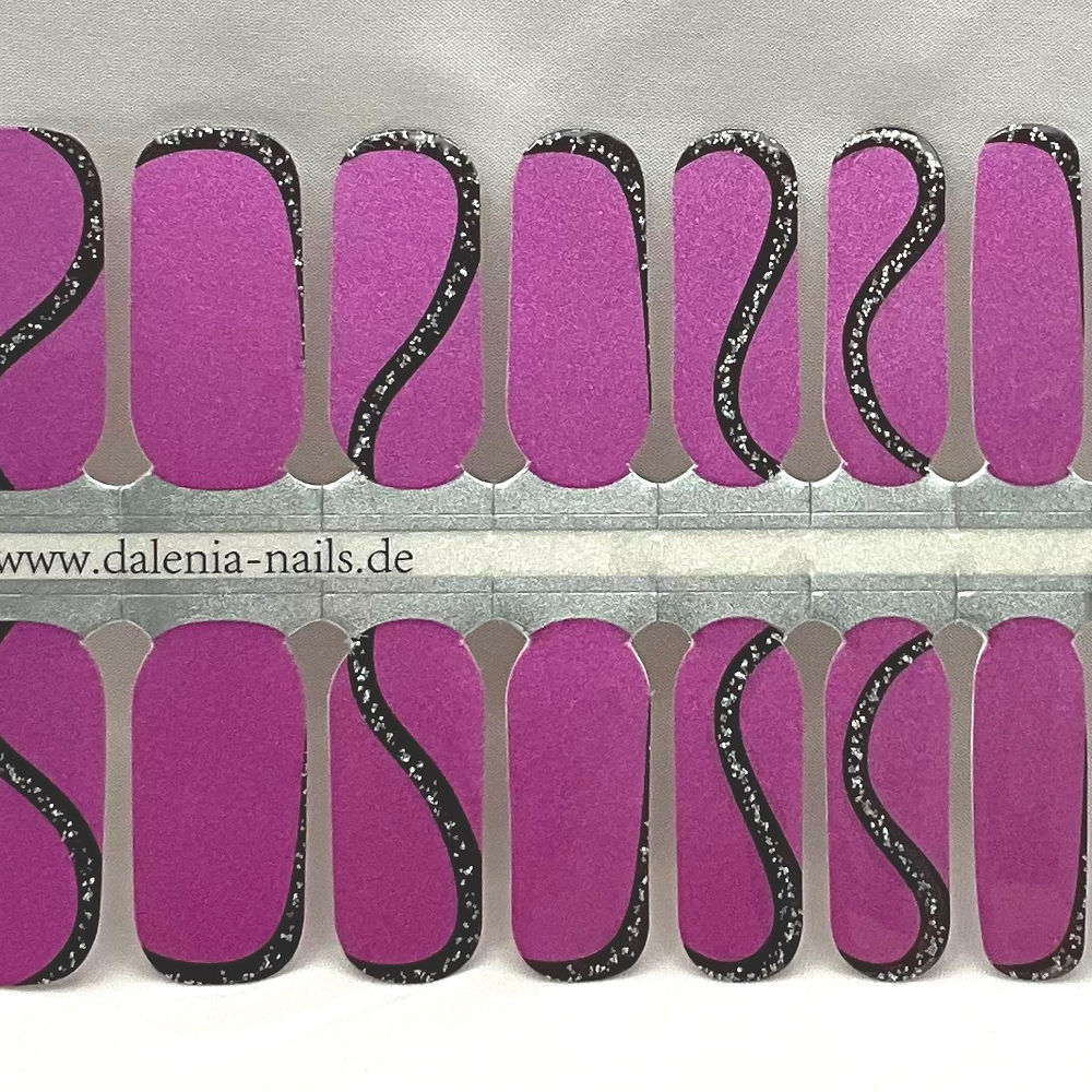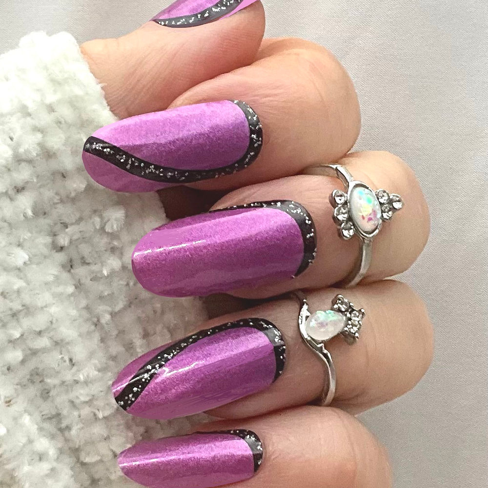 A vibrant pearly pink base with flowing black wave accents and a subtle shimmer running through it. Eye catching without being over the top, and perfect when you want something a bit different.